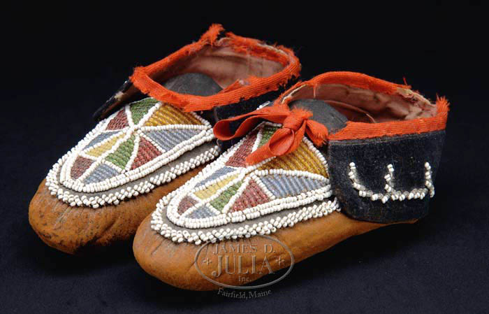 WOMAN’S IROQUOIS BEADED MOCCASINS. Black and red cloth sides with bead work fronts in a white bead trim. SIZE: 3-1/2”h x 8-1/2”l. CONDITION: Red material is as is, bead work and doles are good. 9-73405 (150-300)