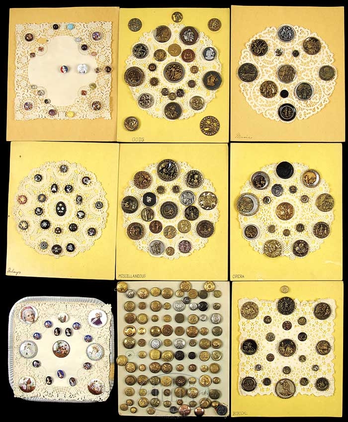 OUTSTANDING ESTATE COLLECTION OF CARDED BUTTONS. A majority of the best buttons are put on 11″ x 9″ cards. The 80 cards include large pictorial, small pictorial, jet, glass, mother of pearl and abalone, metal, inlaid, plastic, paperweight, uniform and more. Also including 44 pie plate cards, 13 miscellaneous sized cards, 4 books, very small lot of loose buttons. Note: upon request we will provide a digital email file of all cards in this lot. SIZE: Varies. PROVENANCE: From a Maine Estate. CONDITION: Generally very good. 9-99076 (3,000-5,000)
