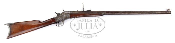 EARLY REMINGTON NO. 1 ROLLING BLOCK SPORTING RIFLE. SN NSN. Cal. 40 (Appears to be 40-50 Sharps straight). Standard early sporting rifle with 29-1/4″ medium to heavy oct bbl, globe front sight in a second dovetail at muzzle. It has the very early Remington sliding ladder rear sight as well as a 1,200 yard military style ladder sight. Mounted with uncheckered American walnut with straight tipped forearm & straight stock with early style crescent buttplate with tang. PROVENANCE: Glenn Marsh Collection CONDITION: Fair to good. No orig finish remains being a light gray patina over all metal with fine surface pitting. There is a crack in wrist and a few minor chips from forearm, otherwise wood is sound retaining a worn smooth patina. Mechanics are fine, strong dark bore. 4-59588 JR14 (750-1,500)