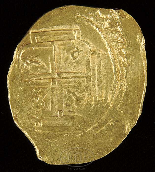 8 ESCUDO GOLD COIN FROM THE 1715 SPANISH FLEET. Accompanying the coin is a Cobb Coin Company, Inc. certificate of Authenticity. Coin #C21 Ex 7 from the reign of Philip V, minted in Mexico, assayer is “M”, circa 1700 with a weight of 26.47 grams. PROVENANCE: An original investor with Mel Fisher. CONDITION: Certificate indicates a “Grade One”, points 149. 9-26326 (2,000-2,500)