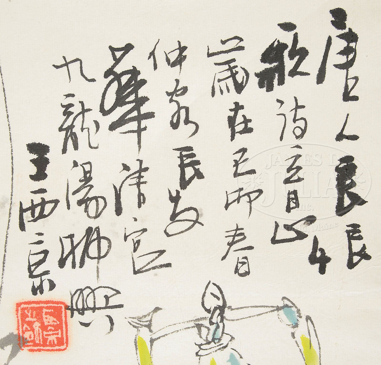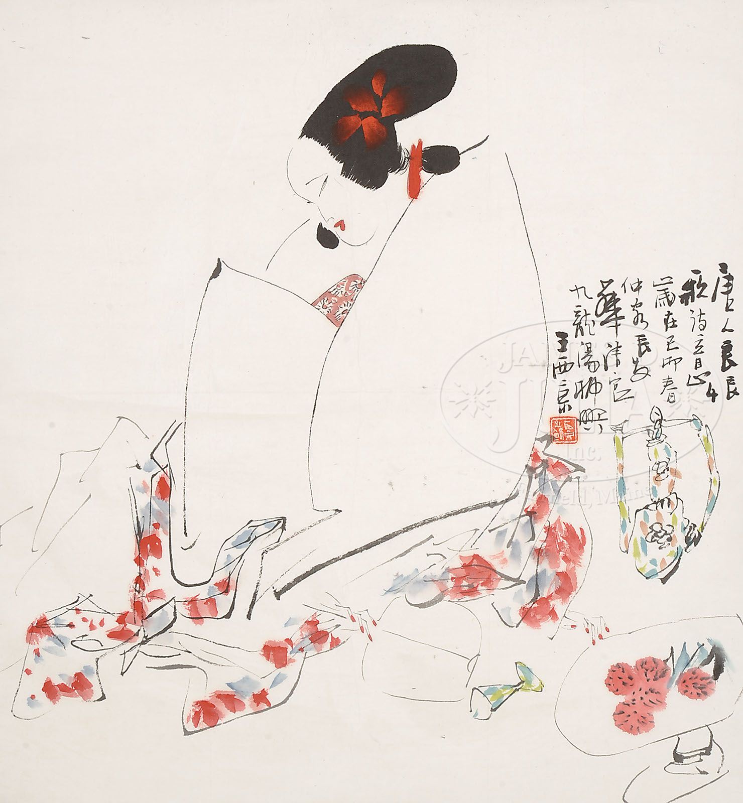 HANGING SCROLL. China, ink and color on paper, depicting Concubine Yang Yuhuan in the Huaqing Palace, inscribed, signed. SIZE: 26-1/2″ x 25″. CONDITION: Good condition with slight creases. 7-73323 (200-300)