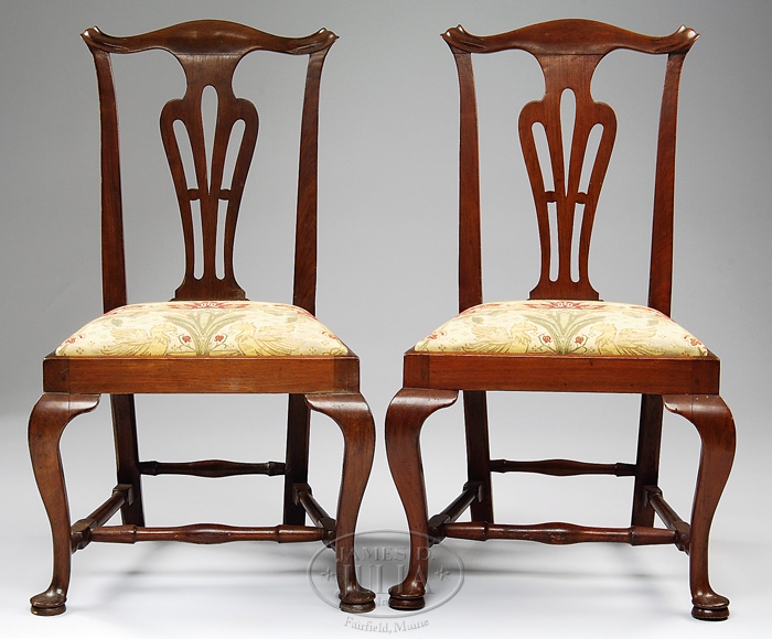 FINE PAIR OF MASSACHUSETTS CHIPPENDALE MAHOGANY SIDE CHAIRS. Last quarter 19th century. Probably Salem area, each with a cyma-curved crest rail terminating in molded ears above the pierced vasaformed splat. Above the trapezoidal slip seat. Raised on frontal cabriole legs and square chamfered backswept rear legs. All joined by a blocked and turned H stretcher, the front legs terminating in platform pad feet. SIZE: 37″ height of back x 17″ height of seat. PROVENANCE: Former property of Nina Nightingale. CONDITION: Each of pegged construction, retaining older surfaces with good patina. No restorations noted. Seat frames appear original. Very good overall. 9-96416 (4,000-6,000)