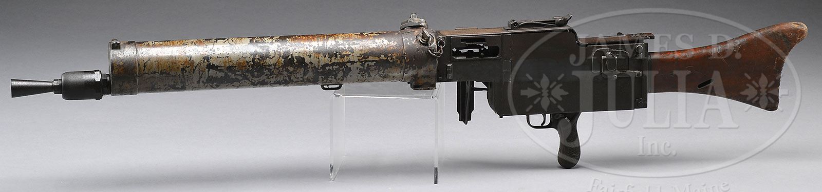 Additional information: This gun is accompanied by a proper “Fusee cover” and “spring assembly” which is not included in the catalog description. **GERMAN MAXIM 08/15 MANUFACTURED IN SPANDAU 1918. (C&R). SN 4969. Cal. 8 mm. 32.75″ bbl. This is a straight forward 08/15. Missing the fusee cover and fusee spring assembly. However the feedblock appears to be complete and matching and the drum hanger is present and matching in SN. Muzzle booster is also present, as is the water drain plug assembly and water filler cap. Both are readily removable. Top covers raises and lowers freely. Charging handle moves. Bbl and rails move freely inside receiver. It appears that feed shuttle functions. Trigger and trigger bar moves freely. It appears that if the missing parts were installed this weapon could be made to function. The 08/15 Maxim was a “lightened” model of the German MG08 Maxim. The 08/15 was used as a “portable” machine gun by the Germans in WWI in large numbers. Utilizing a standard cloth belt, in a drum, on a hanger mounted to the right of the receiver, it was carried into combat utilizing an over-the-shoulder “dragging” strap. As such it could provide “walking fire” to the assault troops. America’s answer to this was the Browning Automatic Rifle, which came too late to Europe to be put into much, if any, combat use. PROVENANCE: Collection of Carl “Bill” Morrison. CONDITION: Overall condition and appearance is fair. About 60% of the orig gray primer remains on bbl shroud, the rest has flaked off, with a deep brown patina. Side plates and receiver exterior, as well as hanger and feed shuttle, with exception of where the fusee cover was, show evidence of deep pitting and corrosion, now browned and arrested. About 20% of inside of feed cover has similar deep pitting as does all of the exterior of top cover. Wooden buttstock shows numerous handling marks, some bruises and gouges, but is complete and sound with the exception of 1″ chip at the toe on the left side. Hand grip is sound and complete, has 3 gouges on left side and has handling marks. The drain plug fitting has had one of the “ears” bent inwards but with careful heating it should be possible to restore it. The wooden thumbpiece on water filler cap is not present, as is common. It is difficult to read the markings on top cover due to the corrosion, however it is discernible. Bore, although dirty and needs a cleaning, has sharp rifling. Booster appears complete, although also has heavy scale consistent with rest of gun. Despite the heavy scale and missing parts, the addition of the missing parts and some TLC could restore this to a functional example of this classic WWI machine gun. 4-48647 JWK4 (4,000-6,000)