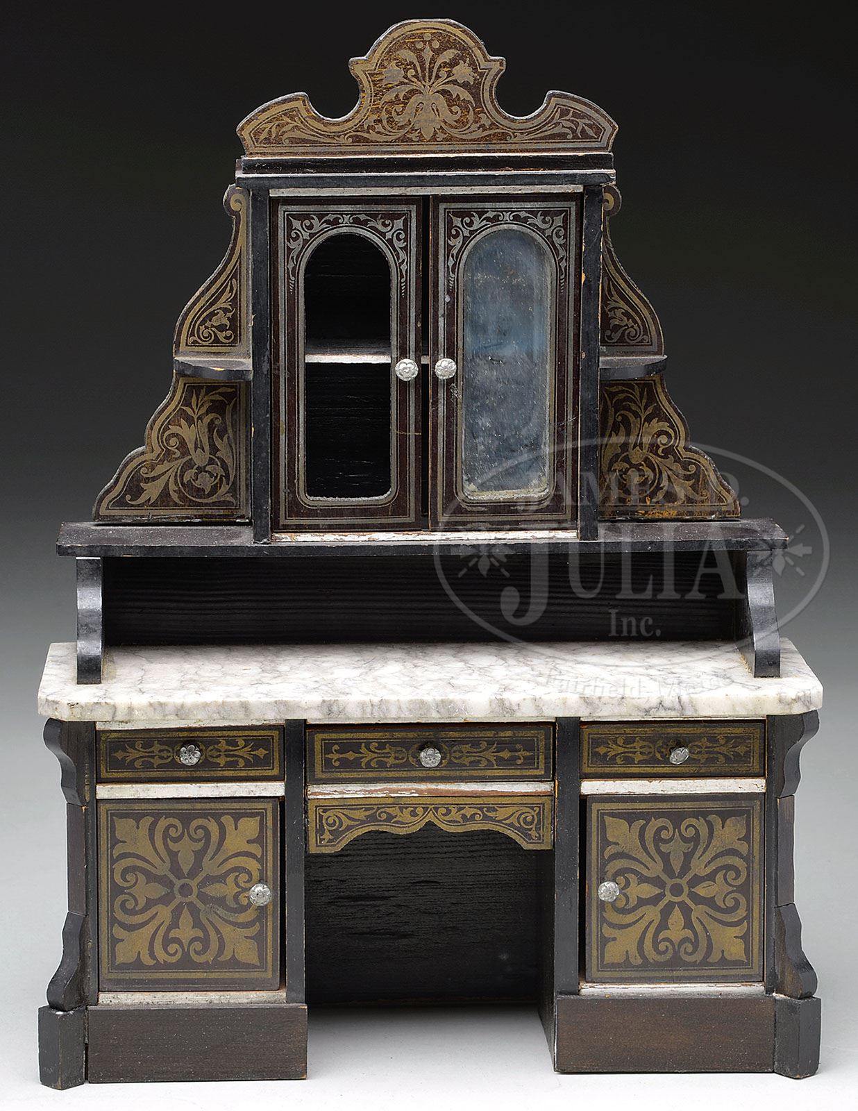 OVERSIZED BIEDERMEIER SIDEBOARD/SERVING CABINET. Overall a very nice original and complete piece of Biedermeier furniture in an unusually seldom found large scale. Approximately 12-1/2″ tall and 9-1/2″ wide this cabinet features 3 drawers over 2 doors and upper dual door display cabinet. SIZE: As stated above. CONDITION: Lacking mirror in one cabinet door. Typical wear most noticeable to white trim work. 1-13287-1 (800-1,200) Auction: Advertising, Toy & Doll - Fall 2013 Please Note: All prices include the hammer price plus the buyer’s premium, which is paid by the buyer as part of the purchase price. The prices noted here after the auction are considered unofficial and do not become official until after the 46th day. |