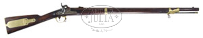 FINE ROBBINS & LAWRENCE MISSISSIPPI RIFLE. Cal. 54. NSN. 33” rnd bbl. Dated “1850” on the lockplate and bbl tang. “WAT” and “JCB” cartouches on the left side of the stock. “J.P.C.” inspector marks on the upper left bbl and “JH” on the left side of the bbl. This was evidently one of the 4,000 furnished to the State of Massachusetts as it has the rare Drake rear sight. CONDITION: Fine with 75%(+) orig bright brown finish on the bbl and bright casehardening colors on the lockplate, turning dark on the hammer with some signs of cleaning. There are a couple of spots of deep pitting near the muzzle and a small hairline in the woodat the rear of the lock and a small, old chip forward of the lock. Sharp edges on the wood. Mechanically fine. 4-57341 FS217 (9,000-12,000)