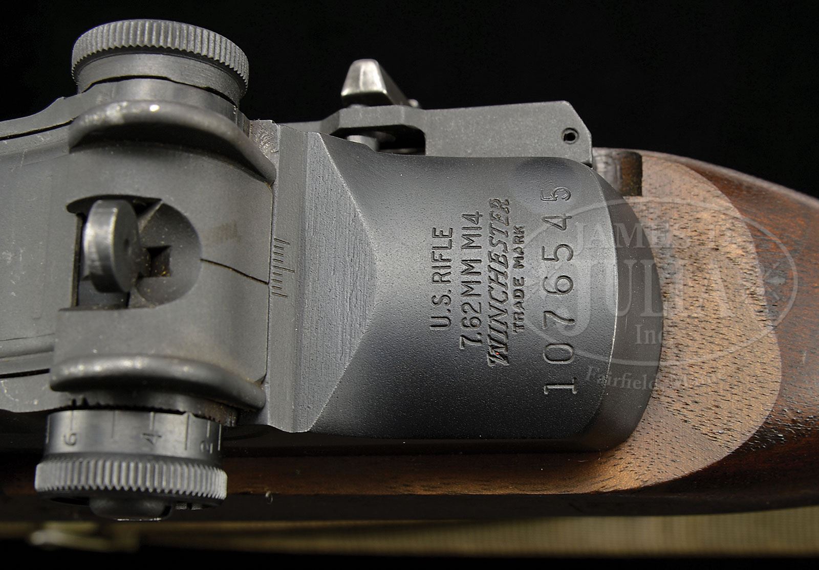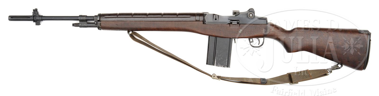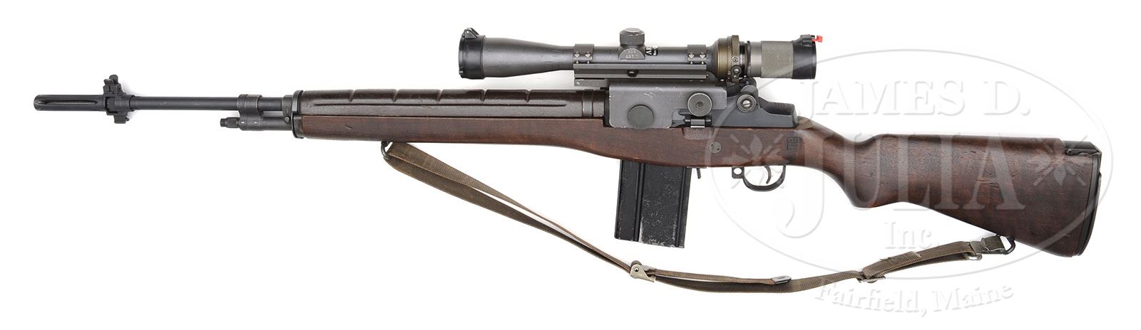 Receiver is a high quality re-weld which is virtually undetectable. **RARE ORIGINAL WINCHESTER MILITARY M-14 WITH AN ACCOMPANYING SCOPE AND SCOPE CASE (C & R). SN 1076545. Cal. 7.62mm, 22″ bbl length. This fine M-14 includes the orig as issued scope & mount in its carrying case and one magazine. Also included is an orig web sling. This example has an American eagle under three stars proof & Circle P on the buttstock. The hand guard is brown composite. The flash suppressor is vintage orig. All of this gun appears to be as issued. Bolt is numbered “7790186 66118-EE”. Scope is “3 x 9 ART II”, and SN on scope appears to be “4640”, but the SN tab is broken off and missing the end. Firing mechanism functions smoothly when operated by hand. This weapon appears fully functional in both semi and full auto. PROVENANCE: The estate of a Private Collector. CONDITION: Overall finish & appearance is extremely fine to excellent with over 95% finish on the blued parts with the wear being where the charging handle rides the receiver and some thinning of the finish on the selector. There is also some brassing to the gas cylinder tube. The wood has some bruises and handling marks, but overall is extremely attractive and in very fine to excellent shape. The magazine is very good with about 85% finish. The scope is in excellent condition, optics are clear. There are some scratches and loss of finish to the scope mount and one significant ding to the lower front. This is a very attractive and difficult to find example and would make an outstanding addition for the U.S. Military collector. No U.S. military rifle collection is complete without one of these. 4-49201 JWK38 (15,000-25,000)