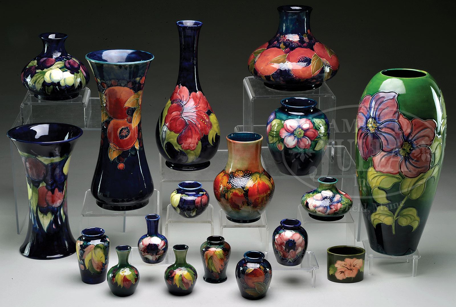 OUTSTANDING COLLECTION OF SIXTY-TWO PIECES OF MOORCROFT ART POTTERY. This collection amassed by one collector and being sold in its entirety. The collection includes: 14-1/2″ high vase with flower decoration, the bottom having a script “W. Moorcroft, Made in England”; 12-1/2″ vase decorated with pomegranates, impressed “W. Moorcroft Potter to the Queen”, also with blue written signature; 10-1/4″ flaring vase with wisterias, impressed “Moorcroft Made in England” with blue written signature; 12-3/4″ gourd vase with lilies having round paper label impressed “Made in England”; 7″ squat vase with pomegranates having green Moorcroft script mark impressed “Moorcroft Burslem England M32″; 8” biscuit jar with pomegranates pattern with hand hammered aluminum cover and hardware impress marked “Moorcroft Made in England”; 5″ squat vase with wisteria pattern impress marked “Moorcroft Made in England 2265″; 6-1/2” squat pitcher with grape and leaf pattern impressed script “Moorcroft Potter to H.M. the Queen, Made in England”; 7″ vase berry pattern impressed script “Moorcroft Potter to H.M. the Queen”; 5″ high x 8-1/2″ wide compote with silver plated base; 3-1/2″ high x 7″ wide compote with paper label and impressed marks. Lot also includes: Nine vases ranging from 2-1/2″ to 4″ high; three 4-1/4″ shallow inverted bowls; six matching cups and saucers; square ashtray; six bowls ranging from 4″ to 6-1/2″ dia.; six covered boxes, round, rectangular, and triangular ranging from 2-3/4″ to 7″ dia.; two 8-1/2″ dia. shallow bowls; two 10-1/4″ plates; an 8″ rectangular tray; 6″ high vase; 3″ dia. butter pat; 9″ oval dish; 9″ oval tray; 3″ high cup; 2-1/2″ high oval vase; and a 2-1/2″ high aluminum mounted sugar bowl with no cover. SIZE: As stated above. CONDITION: Very good, one cup with small chip. 9-90397 (2,000-4,000)