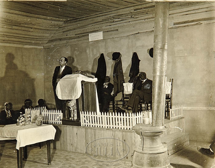 MARGARET BOURKE-WHITE (American, 1904-1971) SUNDAY SERMON-COLLEGE GROVE, TENNESSEE. Black bordered, vintage photograph, circa 1936, shows a man standing beside a pulpit on a small stage with small picket fence. Several men and women of the parish are seated on the back and to the side of him. A pot belly stove is in the foreground. Back having inscribed in pencil “R 96”. At this time Margaret was in Georgia with Erskine Caldwell gathering photographs for their book “You Have Seen Their Faces”. This family grouping in a slightly different pose was used as the front cover of this book. We have been unable to find another image of this photograph published. NOTE: Other photographs from this series are contained in “You Have Seen Their Faces” by Caldwell & Bourke-White. SIZE: Photograph: 7″ x 9″. PROVENANCE: Erskine Caldwell’s wife (Mt. Vernon, Maine); to our consignor’s father through descent. CONDITION: One small closed puncture bottom right, otherwise very good. 9-99883 (2,000-3,000)