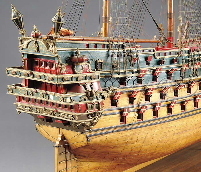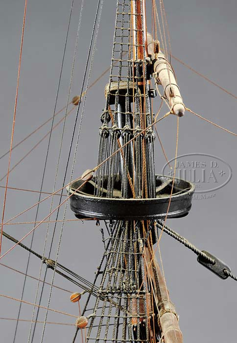 MODEL OF THE DANISH FIRST RATE SHIP FREDERICUS QUARTUS. First half 20th century, American. A very fine scale and ornate model of this, the largest Danish ship of the line ever built mounted with 100 guns. The hull of the model is built up and planked over in yellow pine. The hull planking is held in place with trunnels. Above the waterline a pair of ebonized bands separate the waterline from the lower gun deck. Similar bands separate each of the gun decks up to the deck level. The hull of the model is pierced for 100 guns and each of the gun ports is painted to represent the Danish flag. The topsides of the model, above the sheer line is painted green with gold painted molding just below the bulwark. The interior of the bulwarks are painted red. The model is fitted with numerous ornamental details, including an elaborately carved figurehead, replicas of the Danish crown over the quarter galleries, busts, lions, elephants, figures and many other precisely carved decorations. The deck of the model is also planked and is fitted with numerous details which include: anchors, cannons, ladders, pin & fife rails, belfry with bell, capstan, lanterns, railings, belaying pins and numerous other details. The model is very well rigged and the rigging details include: bowsprit, three masts, cross spars, standing and running rigging all of which is properly led through blocks, served and seized, and the tails lashed to belaying pins. Each of the lower masts is bound and seized to the tops. At the top of each mast and at the bow and stern is flying a hand stitched Danish naval ensign. The rigging includes fore stays, backstays, bracing lies, sheets, halyards, topping lifts, ratlines run through deadeyes, and numerous other rigging details. The model is displayed on a pair of turned brass pedestals, mounted on a mahogany board. Accompanied by brass nameplate “DANISH SHIP/FREDERICUS QUARTUS/100.GUNS/BUILT 1699”. SIZE: 63″ h x 68″ l x 25″ w. PROVENANCE: Robert Frederick Woolworth Estate, Monmouth, Maine. (F.W. Woolworth Store). CONDITION: Hull structurally intact. Painted and decorated surfaces very good. Rigging is at least 90% intact. Model in need of cosmetic restoration including reattachment of many elements and remaking of flags due to deterioration of material. Large and complicated model that remains in very good condition overall. 9-23557 (4,000-8,000)