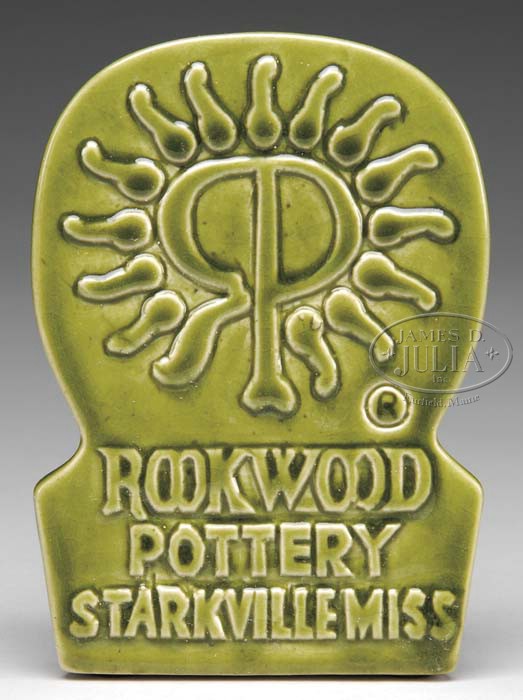 ROOKWOOD POTTERY COUNTER SIGN. Rare Rookwood counter sign displays the Rookwood flame mark with “Rookwood Pottery Starkville Miss” in block letters below. Sign is finished in a bright green glaze and marked on the back with the Rookwood flame mark, “R” and dated “LXV”. SIZE: 4-5/8″ t. CONDITION: Very good to excellent with some very minor crazing. 5-63808 (600-800)