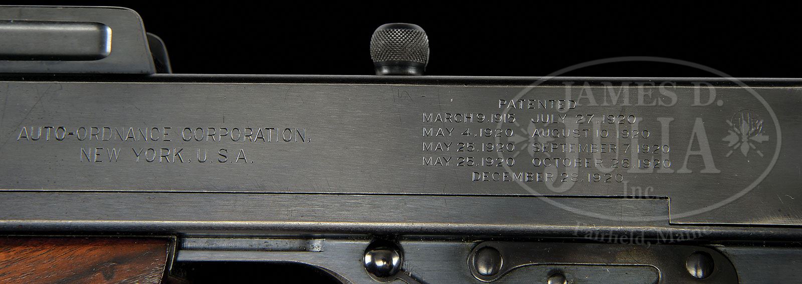 **SUPERB NJ POLICE COLT THOMPSON M1921A SUB-MACHINE GUN (C&R). SN 4668. Cal .45ACP. 10″ finned, uncompensated bbl. Manufactured by Colt’s Patent Firearms Mfg. Co., Hartford, CT. Correct commercial stock without sling swivels and vertical foregrip. Lyman rear sight adjustable for windage and elevation. Internals are all 1921 parts. Firing mechanism operates smoothly when cycled by hand. This weapon appears fully functional. Accompanied by one unnumbered 50 round “L” drum marked “AUTO ORDNANCE CORP./NEW YORK/REGISTERED IN THE/U.S. PATENT OFFICE”; one 20 rnd “Auto Ordnance” marked stick mag and two “Seymour” marked 30 rnd stick mags. Serial number records indicate this gun was once the property of the Franklin, NJ Police Dept. PROVENANCE: The estate of a Private Collector. CONDITION: Very fine. 98% strong orig finish, only very light edge wear on the high points and buttplate. Pistol grip and foregrip in excellent condition with only minor handling marks. Butt stock shows normal handling marks and scratches to the wood, but still very handsome and wood color matches. Bore is very shiny and bright. Bolt face and ejector have crisp lines.Magazine are likewise, very fine. Hard to improve on this desirable configuration. 4-49206 JWD (25,000-35,000)