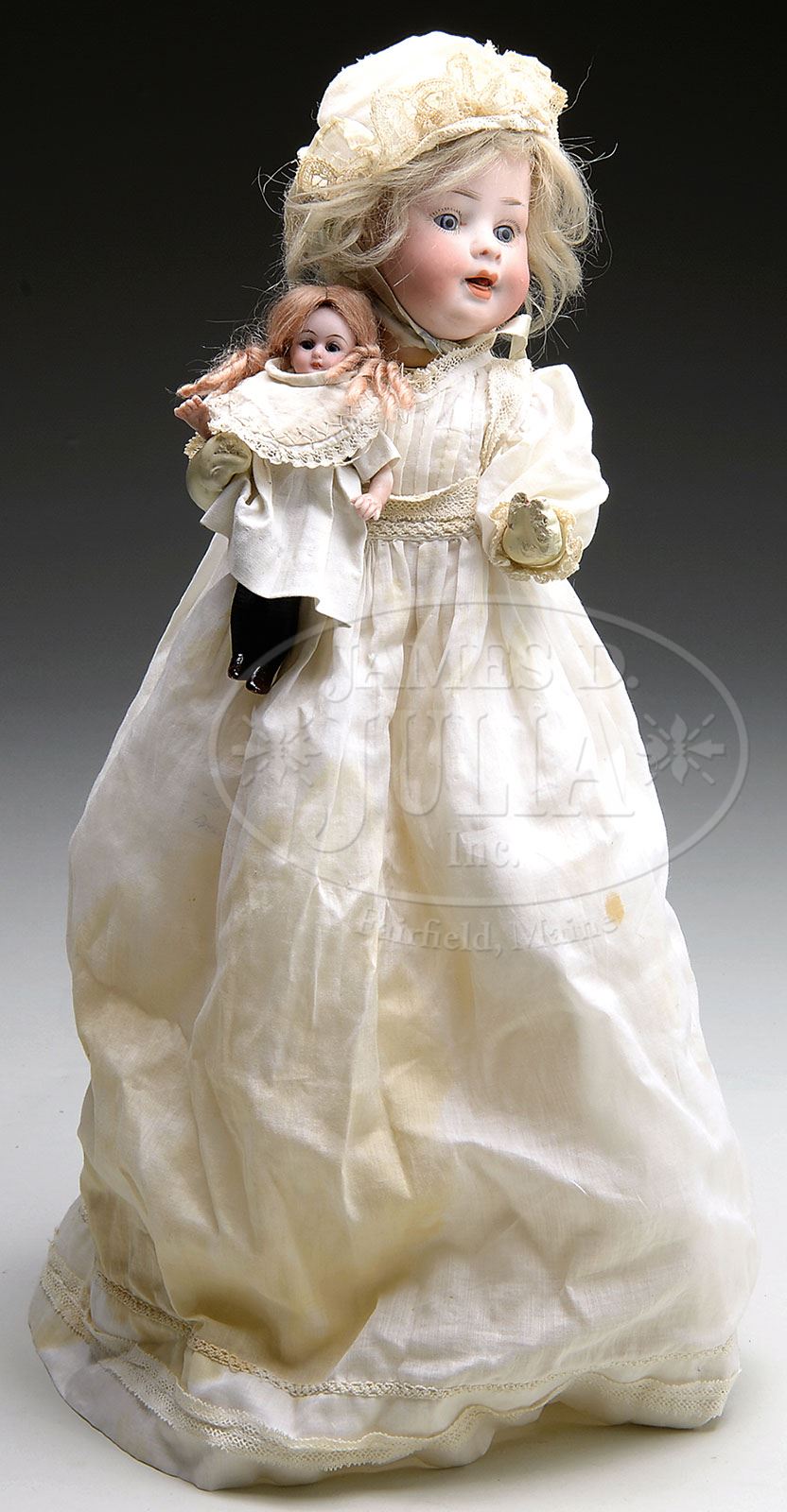 LOT OF TWO GERMAN BISQUE DOLLS. Larger is a character baby with bisque socket head incised “PM 914” and has open mouth with separately molded tongue, blue glass eyes which have been reset in a stationary position, on a five piece bent limb body, and wears an antique blonde mohair wig and long antique white cotton christening gown and bonnet (stained). Also included is a Simon & Halbig all bisque doll with head incised “890” with blue glass eyes (no longer sleeping), open mouth with four tiny upper teeth, on five piece all bisque body jointed at shoulders and hips with painted high black stockings and molded and painted brown mary-janes. SIZE: Baby 10″ (25 cm). All bisque doll 4-1/2″ (11.5 cm). CONDITION: Slight color loss on cheeks of baby, body repainted. Two minor flakes on edge of the all bisque torso at neck socket. 1-13464 (400-600) Auction: Advertising, Toy & Doll - Fall 2013 Please Note: All prices include the hammer price plus the buyer’s premium, which is paid by the buyer as part of the purchase price. The prices noted here after the auction are considered unofficial and do not become official until after the 46th day. |