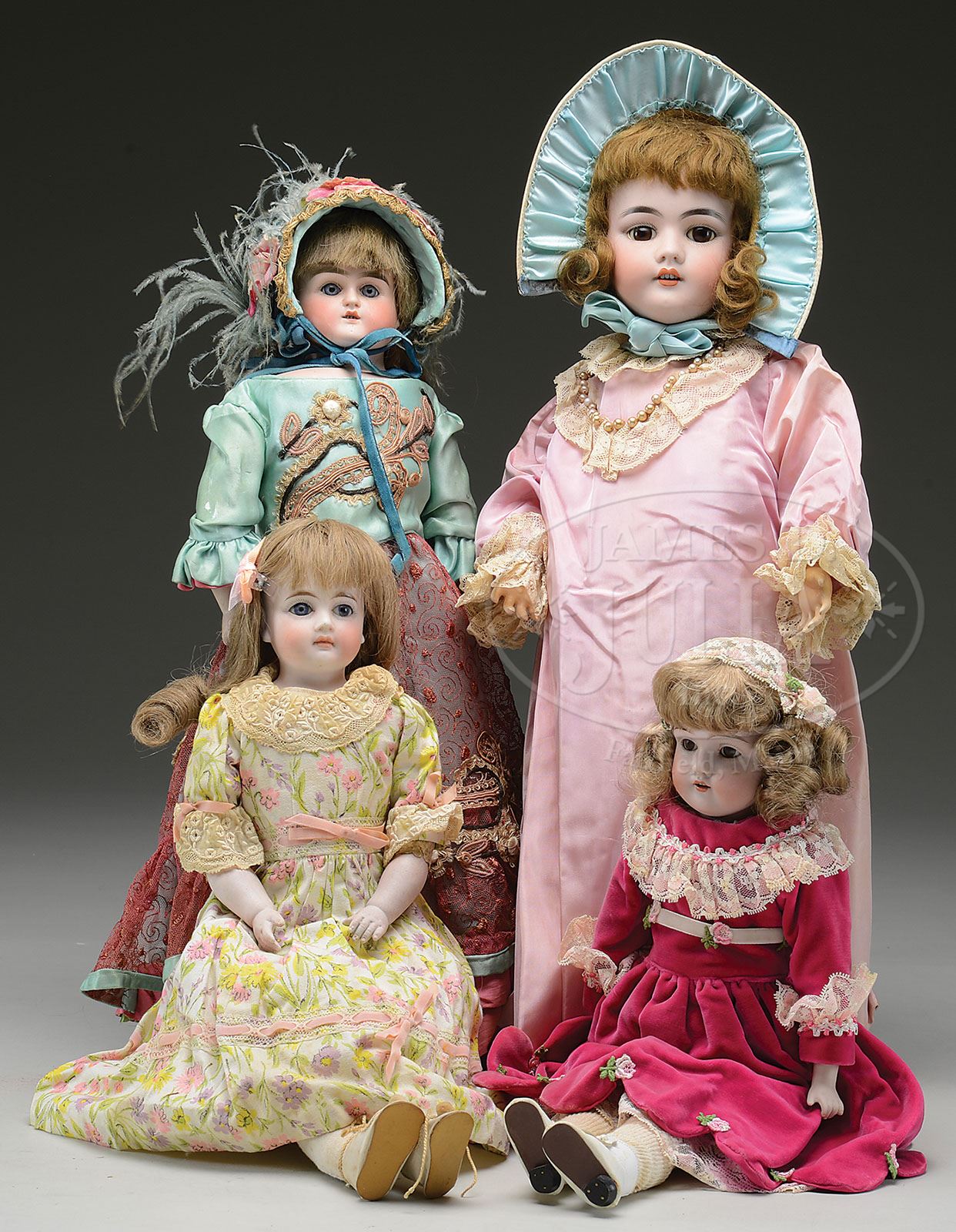 LOT OF 4 GERMAN BISQUE HEAD CHILD DOLLS. The largest is in a rose colored dress is incised “Handwerck” and has brown glass sleep eyes and open mouth with four upper teeth and a full jointed wood and composition body. In addition are three shoulder head dolls; the one in the flowered dress has a closed mouth a solid dome head, blue glass stationary eyes and is on a leather body with bisque forearms. In the magenta velvet dress is a shoulder head Kestner with brown glass sleep eyes, open mouth with teeth on a leather body with bisque forearms. In addition is a turned shoulder head with fixed blue glass eyes, an open mouth with four upper teeth, on a jointed leather body with bisque forearms and wearing an elaborate costume with green top and red lace covered skirt and elaborate bonnet with feathers. SIZE: 22″ (56cm) Handwerck 17″ (44cm) Kestner. CONDITION: Handwerck’s body has been partially re-painted; wig not removed as it is glued tightly to the head. No damage noted on the three shoulder dolls other than just normal age wear. Turned shoulder head roughness on fingertips on right hand. 1-12983 (500-600) Auction: Advertising, Toy & Doll - June 2013 Please Note: All prices include the hammer price plus the buyer’s premium, which is paid by the buyer as part of the purchase price. The prices noted here after the auction are considered unofficial and do not become official until after the 46th day. |