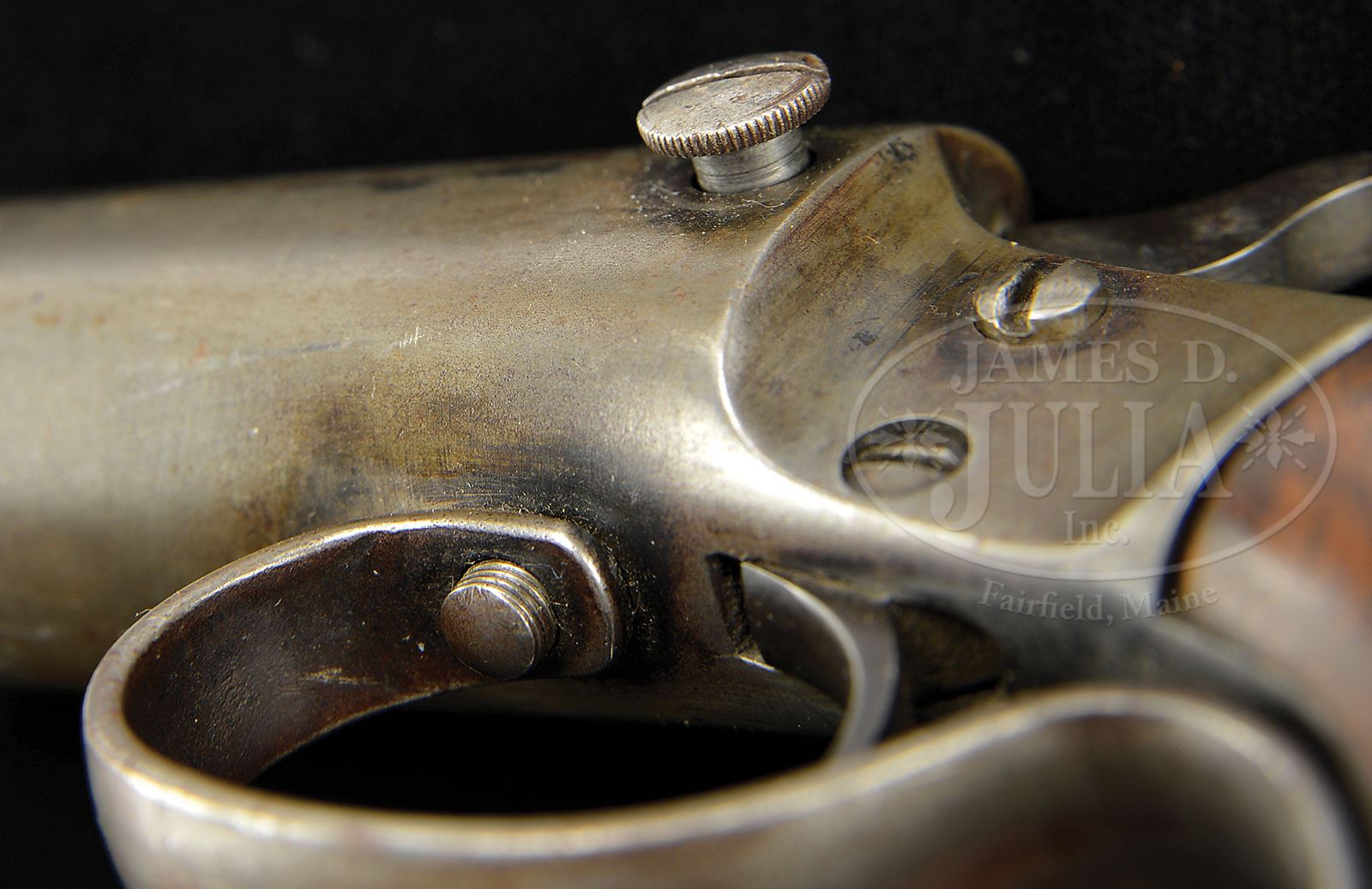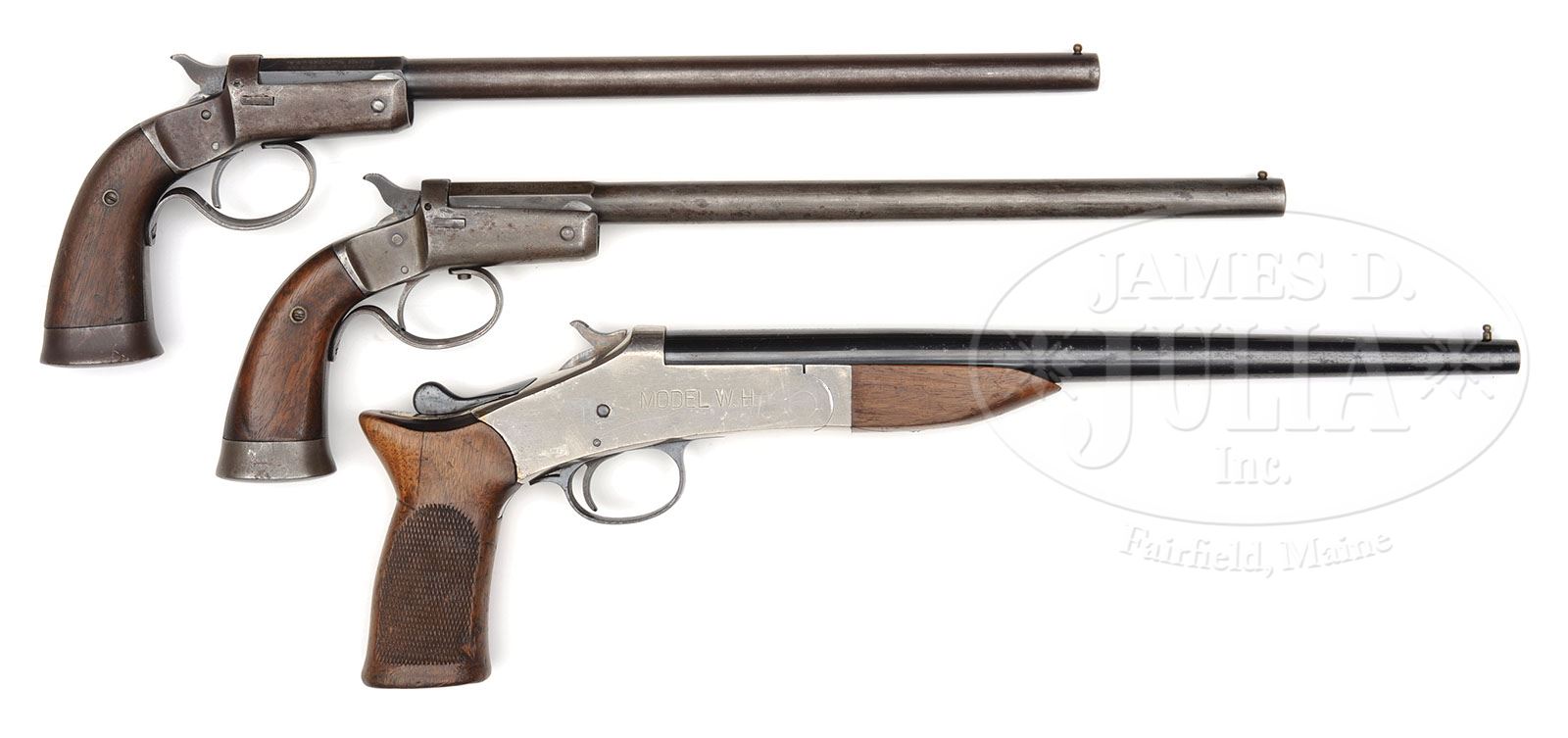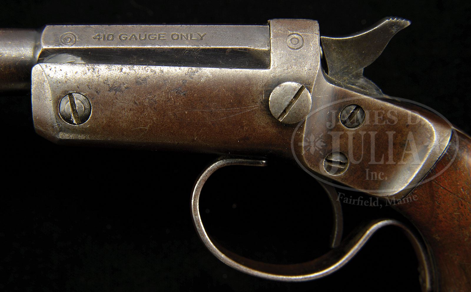 **LOT OF THREE .410 SINGLE SHOT HAND GUNS (STEVENS/STEVENS/HIBBARD)(AOW). SN 40613/T15100/8648. This is a lot of three .410 single shot hand guns classified as “any other weapon”. Gun #1 Cal .410 12 1/8″ bbl. “J.STEVENS ARMS COMPANY / CHICOPEE FALLS, MASS U.S.A” SN “A8648″ marked on bbl, which tips open by depressing a release stud on left side of frame. Registered as 8648. On this model, a lever is affixed to a screw which runs through to the trigger guard with the other end of the lever affixed to the bbl to keep it from tipping further than 45 degrees. The action is slightly loose but still serviceable. Gun #2 Cal .410 12 1/8” bbl. “J.STEVENS ARMS COMPANY / CHICOPEE FALLS, MASS U.S.A” SN “T15100” marked on bbl which tips open by depressing a release stud on left side of frame. On this model, a lever is affixed to a screw which runs through to the trigger guard with the other end of the lever affixed to the bbl to keep it from tipping further than 45 degrees. The action is this gun is slightly loose as well, perhaps less loose than the first but still serviceable. Bbls on both these guns are marked “410 GAUGE ONLY” on left side. Gun #3 was manufactured by Hibbard and is very similar in appearance to the larger single bbl shotguns manufactured by H&R. It is marked “HIBBARD” on the left side of frame and “MODEL WH” on the right side of frame, which is nickel plated. Bbl is marked “MADE IN USA 410 GA CHOKE”. SN matches on bbl and receiver frame. Action closes very tightly. This weapon appears fully functioning and serviceable. CONDITION: #1 Less than 10% blued finish remaining and that only in the recessed areas and on hammer. Balance of metal parts being a pleasing smooth gray patina. Wooden grips are fine with some handling marks. Upper screw on left side of action is a incorrectly sized replacement and the slot of the screw head is deformed. Bore and chamber are excellent, shiny, and bright. Trigger pull is positive and crisp. Safety at partial cock works well. #2 This gun also has less than 10% blued finish remaining and mostly in the recessed areas and on hammer. Balance of metal parts being more of a smooth brown patina. Wooden grips are very good with only very few handling marks. Chamber is good. Bore needs a cleaning, but looks as thought it will clean up well, mostly shiny. Trigger pull is positive and crisp. Safety at partial cock works well. #3 Overall finish and appearance of blue parts is fine. About 90% bright bbl blue overall, with some scratches and area about 1″ x 1/4″ on the left side thinned to bare metal with some slight pitting and patina. Blued bbl release lever retains nearly all of it’s deep lustrous finish with some pin prick corrosion. Nickled receiver retains about 90% of it’s nickel with some oxidation and corrosion along the ridges and a couple of spots on the left side. Blued trigger guard is consistent with the bluing on the rest of the gun. Hammer retains about 20% of it’s case color hardening. Wooden forend finish is mostly flaked off revealing a light colored wood. Hand grip has one significant gouge on the right side front bottom of the checkering about 1/4″ in diameter. Top of grip shows a repair just below the lever where a 1-1/2″ x 3/8″ piece had broken off and then had been cut and squared off and glued back into place. The grip now appears to be completely serviceable. This is a nice grouping of single shot 410’s which should be of interest to collectors. 4-48846 JWK33 (2,000-3,000)
