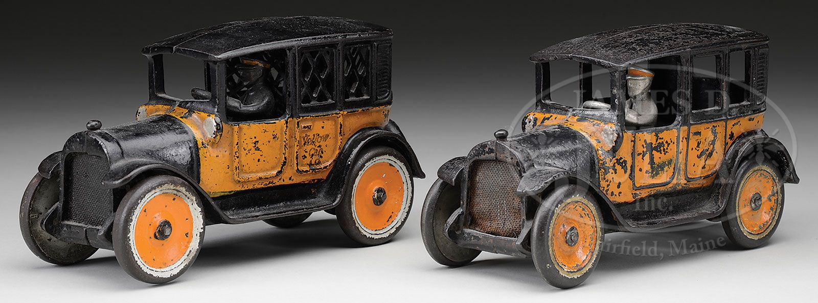 PAIR OF ARCADE TAXIS. The first is the still bank version. This particular piece is in good original condition and retains its original tin trap underneath. The second cab is the typical one found in fair condition. SIZE: Each is 7-3/4″ l. PROVENANCE: John F. Gale Collection, Cambridge, MA. CONDITION: As stated above. 1-12408-1 (350-550) Auction: Advertising, Toy & Doll - Fall 2012 Please Note: All prices include the hammer price plus the buyer’s premium, which is paid by the buyer as part of the purchase price. The prices noted here after the auction are considered unofficial and do not become official until after the 46th day. |