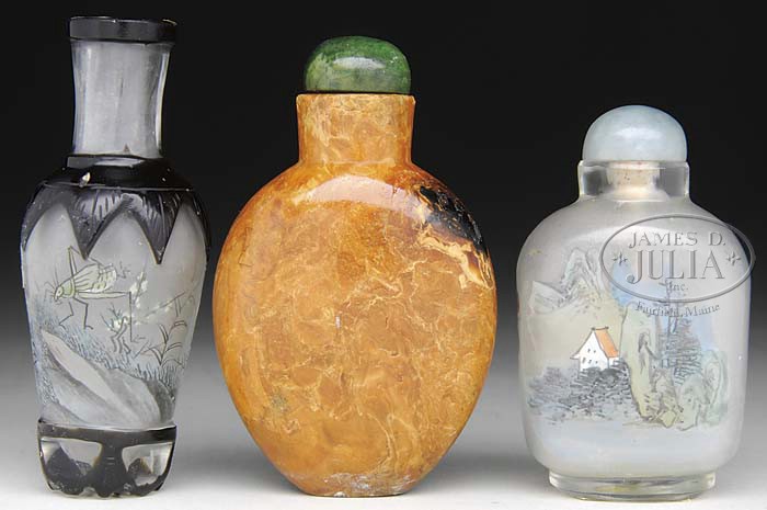 GROUP OF THREE SNUFF BOTTLES. Chinese. Including an amber bottle and two interior painted bottles, one with black cameo carved overlay. SIZE: 1) 2-3/4″. 2) 2-1/2″. 3) 3″. Respectively. CONDITION: Overall very good. Black cameo bottle missing stopper. 9-23694, 9-23696; 9-23697 (200-300)