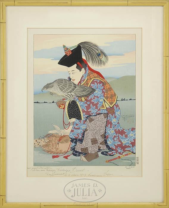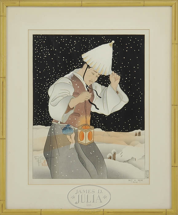 PAUL JACOULET (French, 1902-1960) THREE WOODBLOCK PRINTS. All housed in bamboo style frames with white mattes. 1) “Shepherds of the High Mountains, Korea”, published April 20, 1941. Sparrow seal, having a Maeda/Onodera carver and printer stamp. Pencil signed, number 75 illustrated in the “Prints of Paul Jacoulet”, page 61. 2) “The Bride. Seoul, Korea”, published February 2, 1948. Owl seal, having a Maeda/Honda carver and printer stamp. Pencil signed, number 91 illustrated in the “Prints of Paul Jacoulet”, page 67. 3) “The Laundress. Korea”. Published April, 1955. Peony seal, having a Maeda/Onodera carver and printer stamp. Pencil signed, number 138 illustrated in the “Prints of Paul Jacoulet”, page 80. SIZE: Sight size within matte: 16-1/2″ x 12-3/4″. PROVENANCE: From a large Boston, MA area Estate. CONDITION: Not examined out of frame. Colors are strong, light toning. 9-99305 (1,000-2,000)
