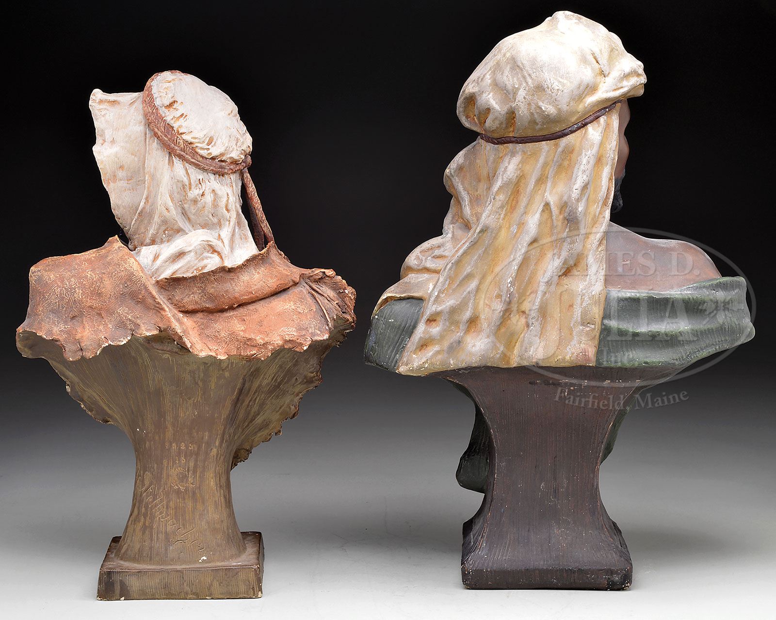 TWO LARGE BUSTS OF TURKS. Both unsigned, one 18″ high, probably Austrian or German, having a black bearded man with white head scarf, and brown shawl. The other a 20″ high man with black beard, off-white head scarf, and green shawl. SIZE: As noted above. CONDITION: Some minor chips and flecks, generally good. 9-29746 (400-600)