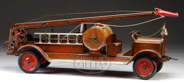 KEYSTONE WATER TOWER. Really great toy that you could actually put water in the tank and it could be pumped out through the water tower nozzle. Has original tank. Painted red with original decals. SIZE: 31″ l. CONDITION: Some parts of more recent vintage. Paint is faded. Overall condition is faded. 1-7373 MC (400-600) Auction: Advertising, Toy & Doll - Spring 2007 Please Note: All prices include the hammer price plus the buyer’s premium, which is paid by the buyer as part of the purchase price. The prices noted here after the auction are considered unofficial and do not become official until after the 46th day. |