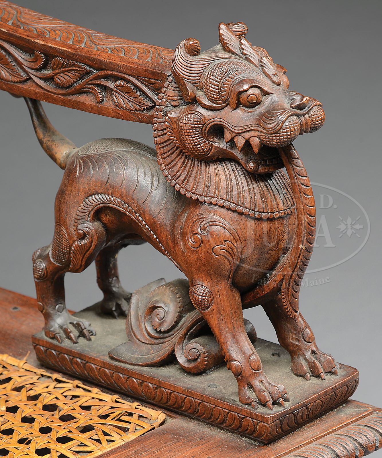 FINE CARVED TEAK ARMCHAIR. Second half 19th century, possibly Tibet. The carved crest with serpent border above a seated Buddhist figure flanked by turned finials above the floral scrolling crest rail. The back carved in deep relief with central figure of a goddess holding serpent and staff between a floral and foliate lyre form frame flanked by acanthus carved styles, joined to downswept arms carved with foliate vinery terminating in chimera supports centering a trapezoidal cane seat, the rails with foliate vinery raised on acanthus carved turned frontal legs, the rear legs square and tapering. SIZE: Back: 40-1/2″ h. Seat: 17″ h. CONDITION: Cleaned surfaces, structurally very good. 9-29745 (200-300)