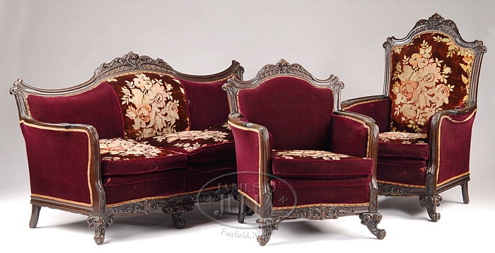 AMERICAN ROCOCO REVIVAL CARVED MAHOGANY PARLOR SUITE. First quarter 20th century. Comprised of a settee and two armchairs, all covered in a burgundy-and-floral velvet upholstery, each molded serpentine crest rail with outscrolled ears, acanthus-carved, centering a scrolled carved crest, continuing to shaped molded arms on conforming supports, each carved with leaftips, centering a rectangular back and floral seat cushions. The carved scrolled legs with conforming upturned feet centering a carved bowed seat rail. SIZE: Settee: 79″ l. x 38-1/2″ h. Armchairs: 48″ h. and 38″ h. CONDITION: Very fine overall with crisp carving, original finish, and original upholstery with acceptable wear, the frames heavy and sturdy. A durable set of high quality. 9-92971 (2,000-3,000)