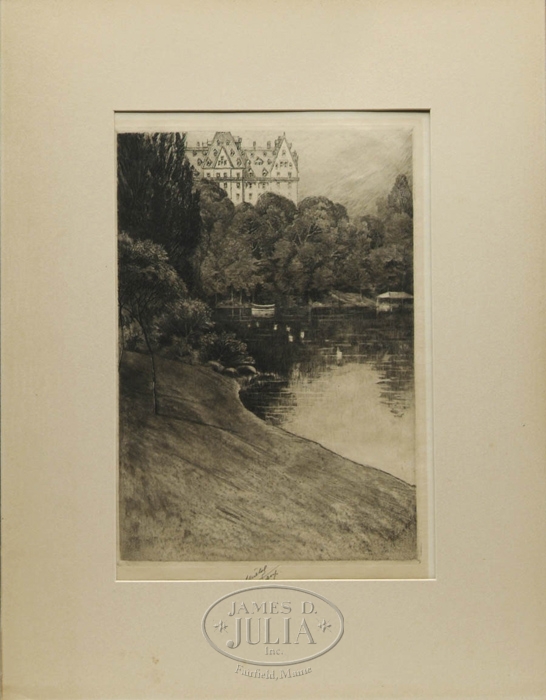 CHARLES FREDERICK WILLIAM MIELATZ (American, 1864-1919) “BIT OF CENTRAL PARK”. Dry point etching shows a pond with ducks, boat and pavilion having a large multi-story building above trees. The title is in script in pencil and also “Trial Proof Third State”. Signed in pencil and also in the plate. Unframed but matted. PLATE SIZE: 10” x 7”. IMAGE: 9-3/4” x 6-3/4”. PAPER: 12-3/4” x 9-1/2”. CONDITION: Hinged at top margin to heavy paper. All over even toning, otherwise very good. 9-29125 (150-250)