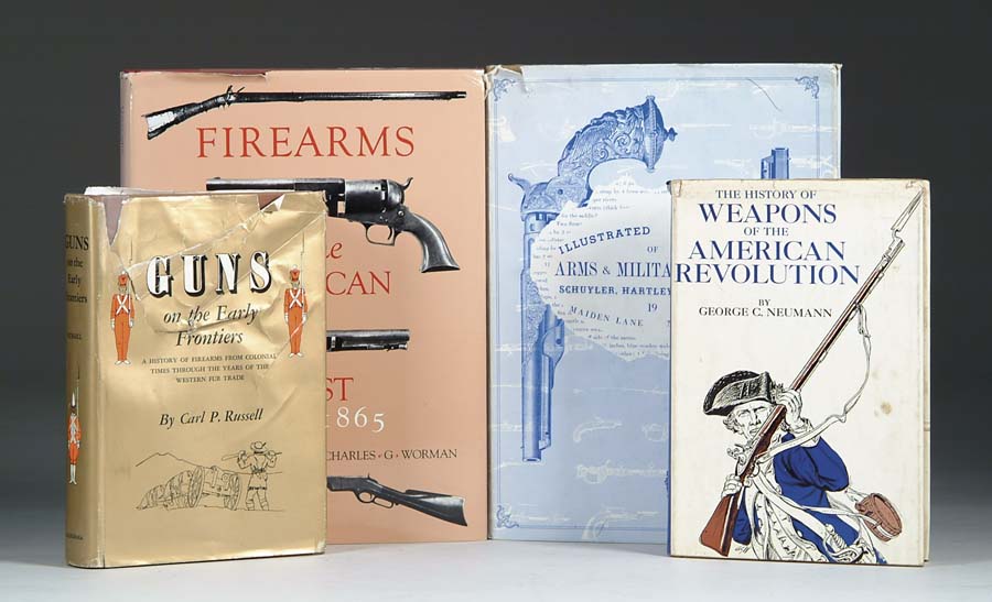 LOT OF APPROX. 20 BOOKS, MOSTLY RELATING TO WEAPONS OF COLONIAL AMERICA, THE REVOLUTION, AND THE CIVIL WAR. Titles include Swords and Blades of the American Revolution by Newmann; Soldiers in America by Troiani; Firearms of the American West 1803-1865 by Garavaglia and Worman; Arms and Armor in Colonial America by Peterson; Civil War Guns by Edwards; The Guns of Harpers Ferry by Brown; the Ames Sword Company by Hamilton, and others. From the collection of the late Bruce McDowell. 4-54842-25 SO29 (150-200)