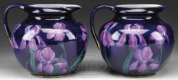 PAIR OF GEORGE JONES IMPERIAL AMETHYST EARTHENWARE PITCHERS. Late 19th century. England. Each with gilded trim and polychrome enameled with flowers to a deep blue ground, printed marks “IMPERIAL/AMETHYST” above crescent enclosing monogram above “& SONS” all above “ENGLAND”. Also, each with purple ink number “22051/12”. SIZE: 9-1/4″ h x 9-1/2″ dia. CONDITION: Each with gilt wear to rim and handle; and small areas of enamel flaking. 9-24867 (300-500)