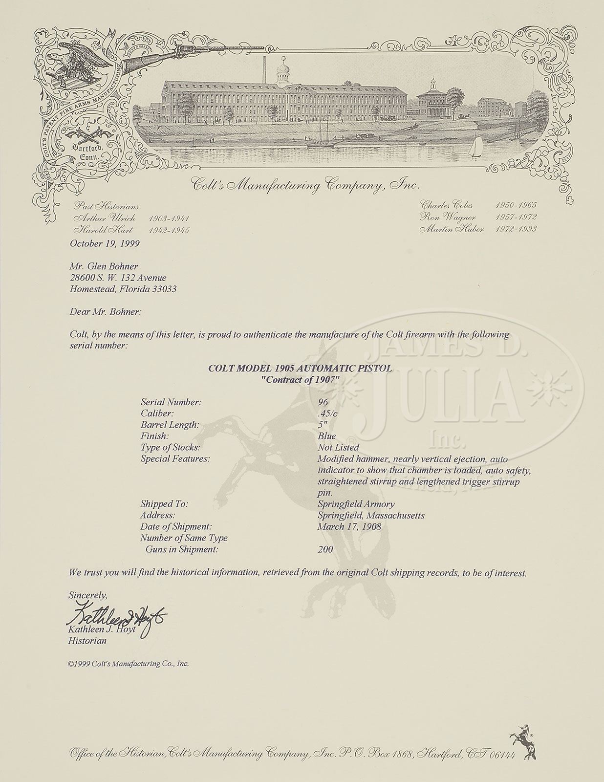 *EXTREMELY RARE COLT MODEL 1907 TEST TRIALS SEMI-AUTO PISTOL. SN 96. Cal. 45 ACP. Blue finish with 5″ bbl, fixed sights and standard 1905 markings on the slide. Frame has a slide stop on the left side and checkered grip safety with a lanyard loop in the left heel. Grip safety is of the later type with extended spur. It is mounted with diamond checkered walnut grips that are modern replacements. Left front web of the trigger guard is stamped with the inspector initials “K.M.” (Major Kenneth Morton). According to The Book of Colt Firearms, Wilson, there were 200 of these pistols delivered to the government on the 1907 contract. Delivery of these pistols was in March 1908 after which they were issued to the 2nd, 4th and 10th Cavalry Regiments later that year. The pistols were deemed accurate but had numerous problems with failed parts including firing pins, sears, failures to feed or eject and occasionally pressing hard on the grip safety caused the pistol to fire. Colt eventually recalled all the pistols for further modification where they changed the hammers and added a longer spur to the grip safety, enlarged the ejection ports, installed heat treated sears and different loaded chamber indicators. By this time John Browning and Colt had learned substantial lessons from the test trials which they then incorporated into in the Models 1909 & 1910, which eventually led to the development of Model 1911 and, as the saying goes, the rest is history. The design of the 1911, for which this pistol was one of the predecessors and prototype, is still in production today, over 100 years later. Few Models 1907 survive today and of those completely orig specimens are rarely encountered. Accompanied by a Colt factory letter which identifies this pistol in Cal. 45 with 5″ bbl, blue finish, type of stock not listed with special features “modified hammer, nearly vertical ejection, auto indicator to show that chamber is loaded, auto safety, straightened stirrup and lengthened trigger stirrup pin, shipped to Springfield Armory in March 1908 in a shipment of 200 guns. Also accompanied by a period mail order flap holster with rolled decorations and a brass closure stud. Additionally accompanied by one orig all blue magazine. Further accompanied by a sales receipt from a gun shop in Macon, Georgia where they had produced grips for this pistol. CONDITION: Fine. Slide retains dark blue around the sights with the balance thin blue mixed with plummy patina. Frame retains about 60% orig blue, strong in sheltered areas, turned brown on the front and backstraps. Hammer retains strong case colors. Grips are sound with sharp checkering. Magazine retains about 85% thinning orig blue. Mechanics are fine. Strong bright bore with scattered fine pitting. Holster shows some dryness and flaking with moderate to heavy soil. 4-47763 JR99 (35,000-45,000)