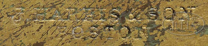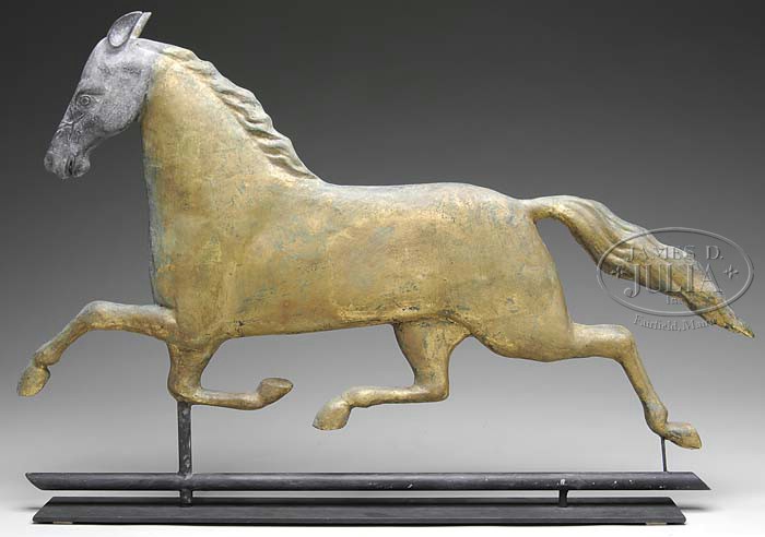 DOUBLE STAMPED J. HARRIS & CO., BOSTON FULL BODIED COPPER HORSE WEATHERVANE. Last quarter 19th century. This large full bodied example retaining original gilded surfaces with verdigris rendered with a zinc head. Clearly stamped on proper left side of weathervane “J. HARRIS & SON/BOSTON”. The second stamp lightly impressed on the proper right side of body partially visible beneath the gilded surface. Offered with a museum stand. SIZE: 25″ h (to stand) x 36″ l. CONDITION: Very good overall. Seams intact. No noted damages. Surfaces appear original with original gilding and some verdigris. 9-22043 (8,000-12,000)