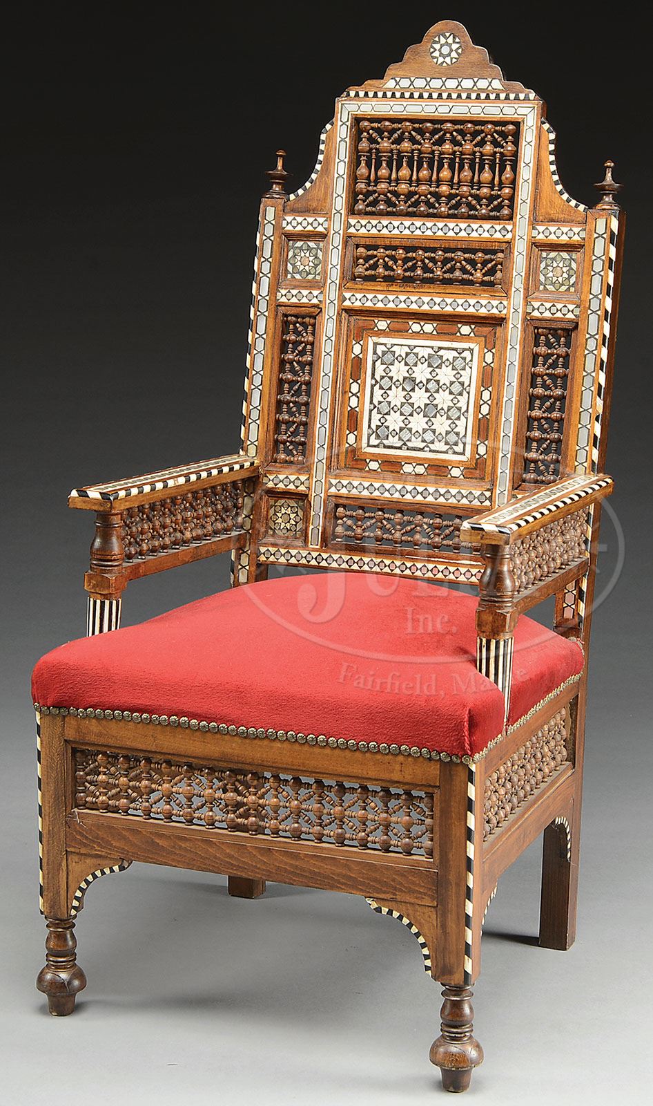 FINE INLAID AND CARVED ARMCHAIR. First third 20th century, Middle East Region. The stepped arched crestrail above panels with ball and spool trellis work above the central molded panel inlaid with ivory, bone, ebony, and square foil devices in a checkerboard pattern within four panels of inlaid rosettes alternating with pierced trellis work. Joined to the rectangular arms inlaid with ebony bordered hexagons within ebony and ivory candy cane striping centering the rectangular over-upholstered seat in burgundy velvet raised on square legs joined by spool trellis work stretchers. SIZE: Back: 48″ h. Seat: 18-1/2″ h. CONDITION: Very good with original surfaces. 9-29735 (400-600)