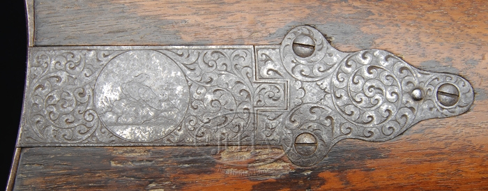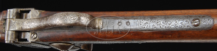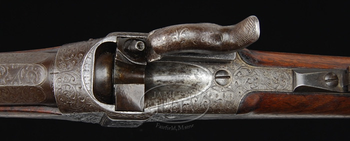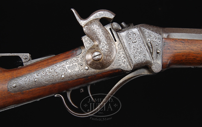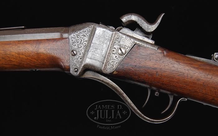 RARE ENGRAVED SHARPS MODEL 1853 SPORTING RIFLE. SN 9551. Cal. 44. Beautiful sporting rifle with 26″ oct bbl, usual 3-line Hartford address with brass blade dovetailed front sight and delicate ladder rear sight. Top tang has a friction tang sight secured with 1 screw. It has double set triggers. Receiver, lockplate, hammer, lever, patchbox, and 2″ of bbl are beautifully engraved, with full-bodied elk in forest scene on left side panel and eagle on a rocky promontory on patchbox cover with the balance of the metal very well executed foliate arabesque patterns with punch dot background. This is either Sharps fine engraving or extra fine engraving. Receiver and lockplate have early type markings. SN is in the usual place on top tang, but is partially covered by the tang sight and was relocated into a panel to the left and rear of the loading recess in the receiver. Buttplate tang is engraved to match. Mounted with straight grain American walnut with uncheckered, round, pewter tip forearm and straight stock with carbine buttplate. Only 61 to 68 of these rare rifles were made in the period July 1854 to December 1859. PROVENANCE: Glenn Marsh Collection. CONDITION: Fine. Bbl retains traces of orig brown in the most sheltered areas, stronger on forearm with the balance a dark patina with a few scattered spots of light rust. Receiver, lever, lockplate, hammer, and patchbox are a dark gray patina. Stock has a tiny sliver missing by bottom tang with a series of small gouges by the toe and patchbox, a gouge in the forearm and a chip missing from bottom of forearm, otherwise wood is sound and retains a smooth, hand worn patina. Mechanics are fine. Bright, shiny bore with scattered pitting, primarily just in front of chamber. 4-59687 JR159 (12,500-17,500)