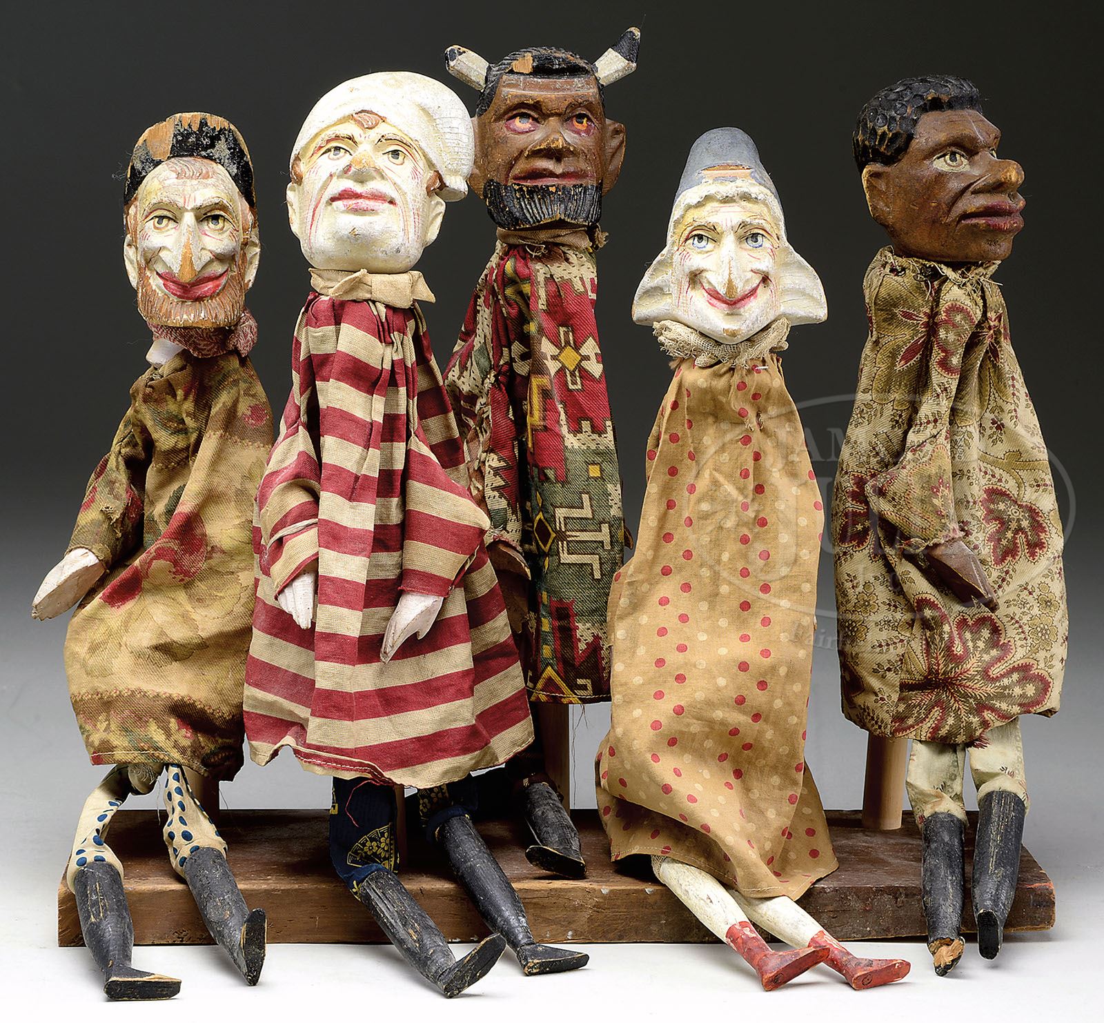 GROUP OF FIVE 19TH CENTURY PUNCH & JUDY PUPPETS. Beautifully carved wooden head puppets with excellent patinaed hand painting. Wooden hands and feet on all. Period clothing. SIZE: 12 to 13″ t. CONDITION: Replaced dowels on all puppets and set within a wooden plank base. Appropriate wear and aging – good to very good. 1-13473 (800-1,200) Auction: Advertising, Toy & Doll - Fall 2013 Please Note: All prices include the hammer price plus the buyer’s premium, which is paid by the buyer as part of the purchase price. The prices noted here after the auction are considered unofficial and do not become official until after the 46th day. |