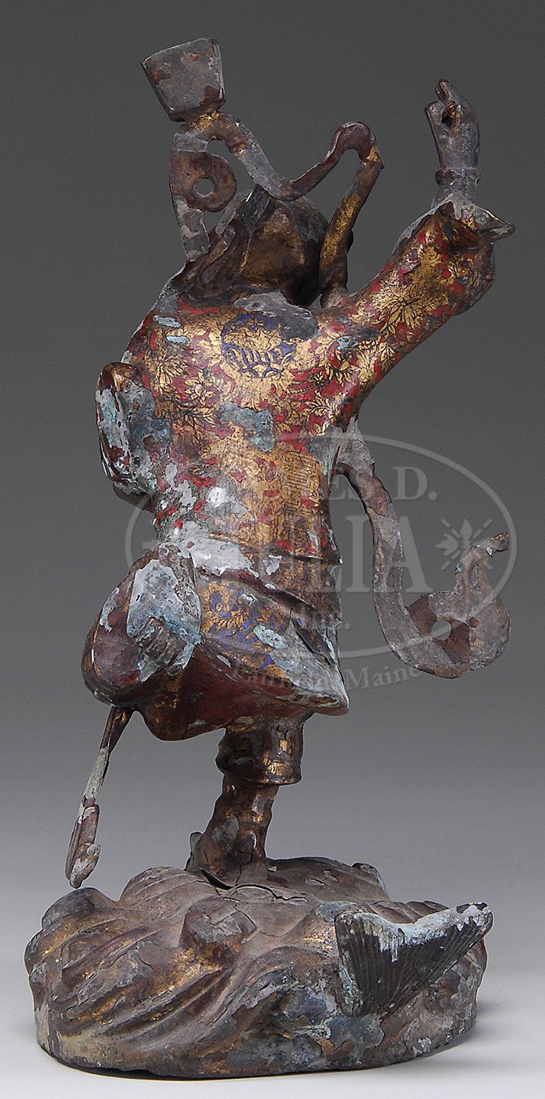 BRONZE FIGURE OF A CHINESE DEITY. 19th century or earlier, China. The figure cast astride a fish within a rough ocean depicted in polychrome and painted gilt robe framed by a scrolling scarf headed by an incense cup. SIZE: 17-1/2″ h. CONDITION: Casting very weathered with losses to seventy percent of paint and gilt surfaces with overall surface corrosion. Structurally good. 9-28399 (200-300)