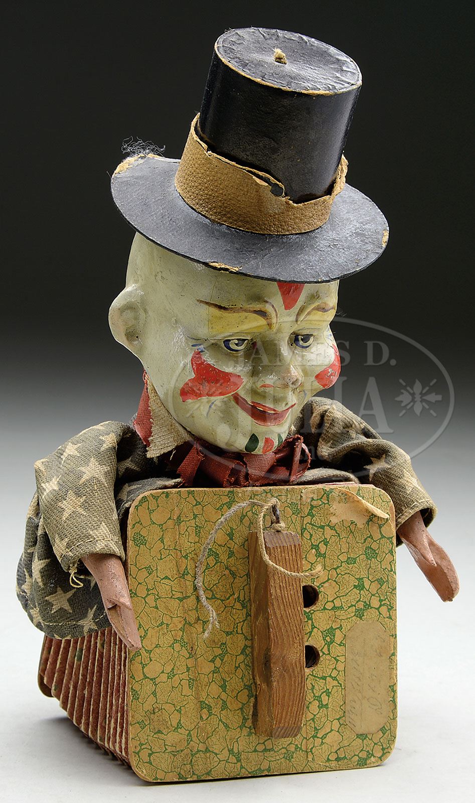 PAPIER MACHE CLOWN CANDY CONTAINER. Circa 1920 Germany. A very cool clown toy who holds working papier accordion in hands. Candy container clown is dressed in red, white, and blue clothing with star design blue material for jacket. Beautiful polychrome paint with excellent facial detailing. Figure wears black top hat that removes to reveal candy enclosure. An Uncle Sam inspired appearance on this very attractive toy with a bonus feature of a hidden candy container! SIZE: 9″ t. CONDITION: Accordion works with great sound. Some cracks to papier mache head. Clothing has some fading. Toy remains overall good plus. 1-13490 (400-600)