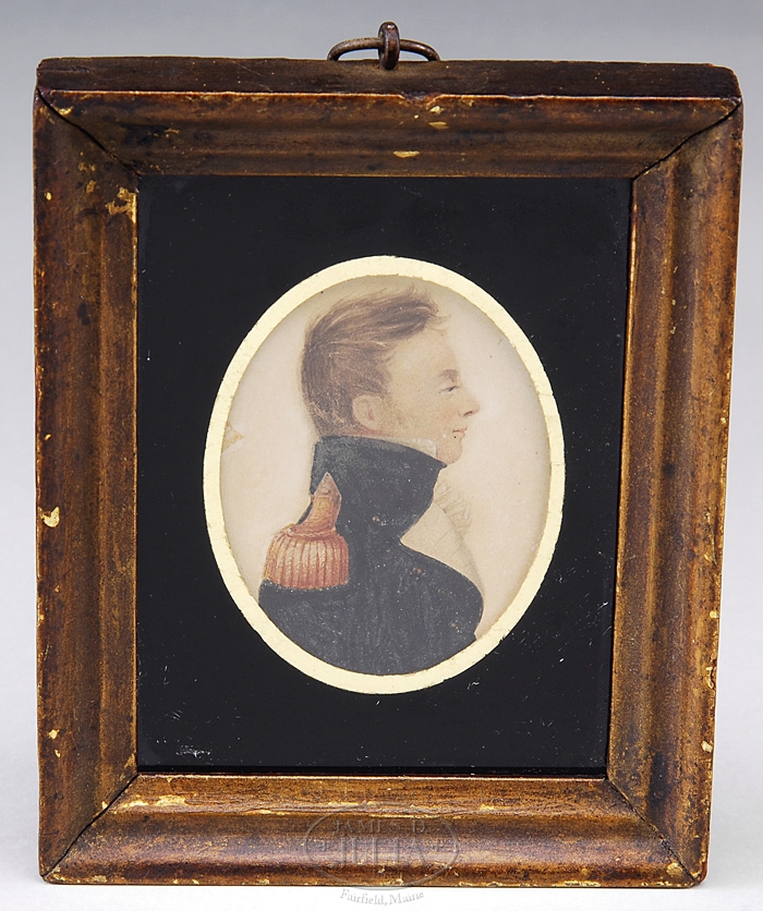 EZRA AMES (AMERICAN, 1768 – 1836) MINIATURE PORTRAIT ON PAPER OF MILITARY OFFICER. Signed on reverse, “CAPTAIN BURDETTE, EZRA AMES 1806 ALBANY”. Ames was born in 1768, died 1836 worked in Massachusetts and New York. SIZE: Oval image 3″ x 2-1/4″. CONDITION: Generally good. 9-97634 (1,250-1,750)