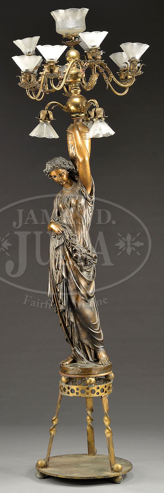 MAGNIFICENT FIGURAL FLOOR CANDELABRA. This outstanding piece centered on a 50″ high figure of a woman holding a garland of flowers with another up-stretched arm. The round base having an oval signature inscribed “FOURMENT HOUILLES VAL D’OSNE”. The figure mounts to a 22″ high bronze stand with round top and bottom with three supporting inside legs. In back of the woman’s head is a receiving hole for the 32″ high thirteen branch brass chandelier. The arms are on outstretched S-shaped arms as well as J-shaped arms, three are downpointing, nine are uppointing, one on top. Presently electrified with the arms decorated with attached leaves. A set of matching twelve 3″ x 6″ etched shades along with a single 5″ x 8″ shade accompanying the chandelier. SIZE: Height: 104″, Diameter: 24″ CONDITION: Wonderful aged bronzed patina to figure and chandelier, base has finish wear. 9-90035 (4,000-6,000)