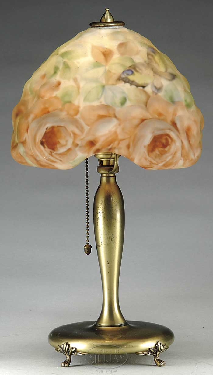 PAIRPOINT PUFFY BOUDOIR LAMP. Signed base and shade. The puffy shade reverse painted with rose blossoms and a yellow swallow tail butterfly with blue highlights amongst foliage. The shade stamped “patented July 9, 1907”. The tapered base stamped with company logo, Pairpoint 3047 1/2, made in U.S.A. SIZE: h. of shade 5-3/4″ x overall shade d. 9-1/4″ overall h. of lamp including finial 15″ CONDITION: The shade with flea bites on top rim beneath finial, the base rim with minor flecks. Otherwise very good. The base with lacquered brass finish showing minor pitting. 9-20314 (2,500-3,500)