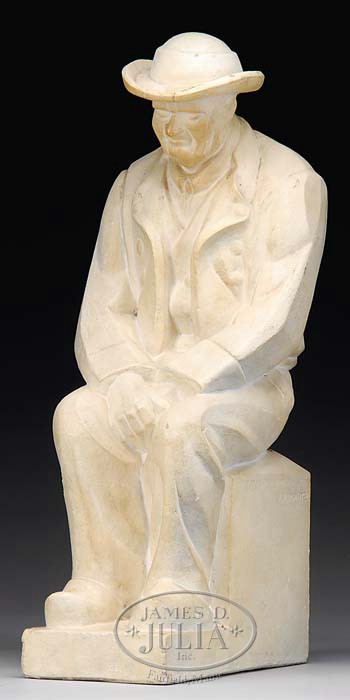 JAN & JOEL MARTEL (French, 1896-1966) “A MONSIEUR L’ABBE ROUSSEAU”. Cream patinated terracotta sculpture of a seated man with hands in his lap wearing a suit and wide rimmed hat. Title inscribed and signed “J. J. Martel” on base. A wonderful Cubist sculpture. SIZE: 16-1/4″ h x 8-1/4″ d x 4-1/4″ w. CONDITION: Hat repair, small flakes and chips to base and some minor patina loss. 9-95152 (800-1,200)