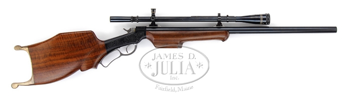 J.M. PENROD CUSTOM BALLARD SINGLE SHOT TARGET RIFLE. SN 11252. Cal. 22 LR. Fine target rifle with 28″ heavy rnd bbl, made without sights and mounted with custom scope blocks containing a Lyman Targetspot scope. Receiver is factory engraved with vignette of a deer on left side and a bear & dog on right side. Surrounded by foliate arabesque patterns and heart shaped border. Top tang has three holes. Mounted with highly figured, uncheckered American walnut with a heavy, black, insert Schnable tipped forearm that has a flat bottom rest similar to the Winchester High Wall target rifle in 30-06 caliber. It has full loop lever and brass Schutzen buttplate. PROVENANCE: Glenn Marsh Collection. CONDITION: Fine to very fine. Metal retains virtually all of its custom blue and wood is sound and retains about all of its custom oil finish. Will not hold in safety notch, otherwise mechanics are fine, brilliant shiny bore. Optics are fine. 4-59546 JR125 (1,500-2,500)