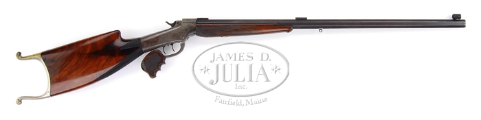 (Additional Information)Very,very scarce. Only few known with Pope barrels, probably no more than 10-12. CUSTOM POPE-BALLARD SINGLE SHOT TARGET RIFLE. SN 18125. Cal. 22. Fine Pope-built target rifle with 30″ medium weight oct bbl, globe front sight with no provision for a rear sight, with scope blocks on top flat and four holes to relocate scope blocks. This appears to be a No. 3 weight Winchester made bbl and forearm is from a Winchester single shot rifle. Top flat is marked “H.M. POPE HARTFORD, CONN” and bore has left hand twist rifling. Two of screwholes are through bbl marking. It has dbl set triggers with a custom extended lever with checkered walnut block filler and checkered tip. Mounted with very nicely figured shell grain Schutzen-style buttstock with checkered wrist & deep cheekpiece with Pope-style nickel plated brass Schutzen-style buttplate. Forearm as previously noted, is from a Winchester High Wall with black insert schnable tip custom contoured to Ballard action with coarse checkering. There is a brass palm rest stud through forearm, dovetailed into bottom flat. PROVENANCE: Glenn Marsh Collection. CONDITION: Fine. Bbl retains 85-90% dull orig custom blue and receiver 35-40% faded case colors with balance turned silver with some brown on right side and front edge. Stock has a hairline in wrist and forearm missing a sliver from right side with a crack near top, otherwise wood is sound. Forearm retains about 50% varnish and buttstock with a series of fine scratches retains about 75% orig varnish. Mechanics are fine, strong bright bore. 4-59549 JR114 (4,000-7,000)
