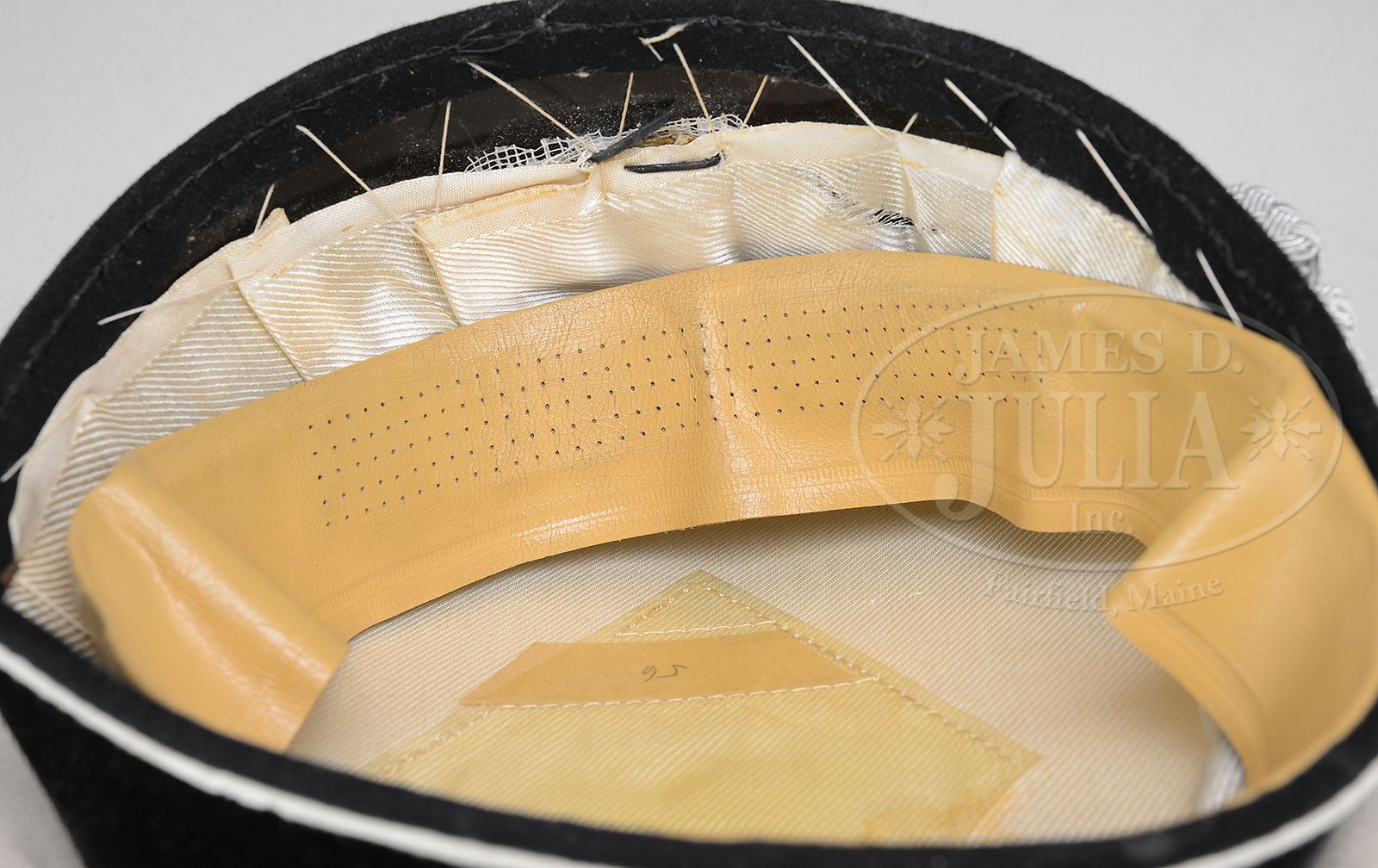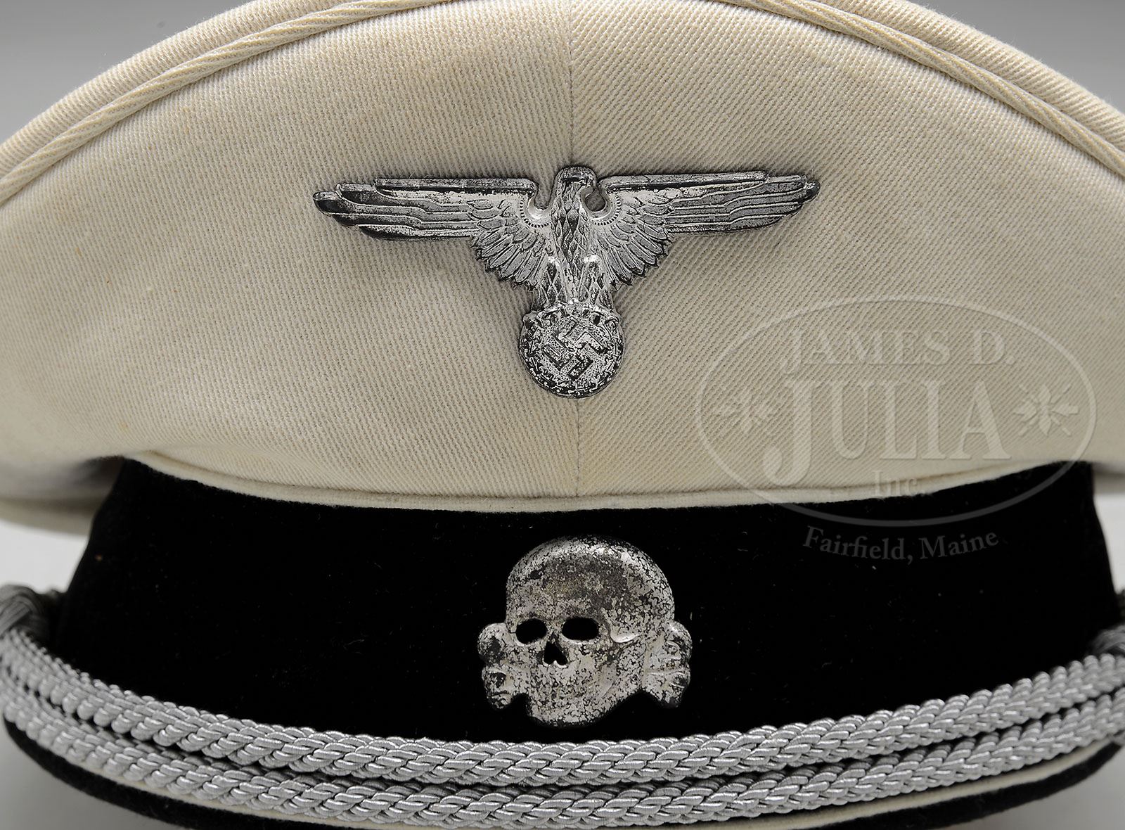 Important positive info: We made a mistake in the description of these rare hats. We stated visors were patent leather which is not correct. They are Vulcan Fiber painted black which is exactly the way the hats were originally made. They are 100% correct. RARE AND SPECTACULAR SET OF NAMED AND RESEARCHED ALLGEMEINE SS OFFICER’S VISOR CAPS. Unique offering acquired from the estate of a WWII Veteran some years ago. The first is a textbook example of the Allgemeine SS officer’s standard issue black wool visor cap. It has a very nice saddle shape and the body of the cap is in very sound condition with no visible issues. The centerband is made of a black velvet material which, combined with the silver bullion chincords and silver pebbled buttons, identifies this as an officer’s model. The SS eagle and skull are original to the piece and made of tombac with a silver plating. These show some typical lifting of the plating. The black patent leather visor is in place and shows only light wear. The underside of the visor has the cross-hatching and faint but still readable proper RZM/SS ink markings. The size 56 marked interior is a crème colored rayon material. The complete celluloid moisture shield is intact with the large SS runic symbols. This also has the desirable rayon RZM(quality control) tag as issued by the office of the Reichsführer Himmler. The cap is clearly named on a paper tag to SS Captain (Hauptsturmführer) Emil Bihler (researched with details later in description). He was attached to SS Subdistrict XXVIII. The interior has quite a bit of staining but is still intact. The brown leather sweatband is intact and still supple. There is a large oilcloth maker’s tag indicating an early production example. This has the RZM maker’s information on one side and the owner’s name is written on the other side (Emil Bihler). This has become detached but will be included. Overall this pieces shows light use and grades near excellent. The second part of this lot that came together with the black cap is the incredibly rare summer version of the Allgemeine SS officer’s hat. This white topped visor is a museum quality example with the top made of a fine quality white tricot material. It has a wide ribbed white piping along the top rim. The black velvet centerband is piped in white on the top and bottom. The silver bullion chincords are secured to the cap by two silver pebbled buttons. The matched silver plated tombac eagle and skull are original to the cap, show good detail and have a nice aged patina. The black patent leather visor with brown underside has clear RZM/SS markings. The size 56 marked white interior is very clean and retains a complete celluloid diamond. The light brown leather sweatband is supple and complete. Based on the observed construction characteristics, we believe this cap was produced by the firm of Clemens Wagner of Braunschweig This cap is not named but there is little doubt that it also belonged to SS Captain Bihler as it is the identical size and was found together at the same estate sale. This is a unique opportunity to acquire a very important set of rare and genuine German SS visor caps. PROVENANCE: This offering will also include over 120 pages of research done on the owner of these caps. This information, gleaned from the National Archives, provide us with considerable insight. It also presents the buyer with the opportunity to do further research. Emil Bihher was born on the 13th of October 1901. He joined the NSDAP on the 1st of May 1933 and was party member 3,968,302. He then joined the SS on the 1st of August 1934 and was given SS# 253,754. He eventually attained the rank of Obersturmbannfüher (Major) on the 30th of January 1944. He was married and his wife was a member of the woman’s league (Frauenschaft). Up through 1942 he remained as Staff leader of the Allgemeine Sub-district XXVIII, then he was transferred to the Waffen-SS. He was awarded the Russian Front and wound badge (didn’t stipulate which one) and ended up attached to the Croatian Mountain Unit Handschar (not a fun assignment). More research might reveal additional details. CONDITION: This very desirable cap, which is missing from all but a very few German WWII headgear collections. When it was originally purchased out of the estate(and when it was consigned to us) the visor and sweatband were separated. We made arrangements to have Mr. Ben van Koningsveld of London, England, who is one of the world’s leading restorers, restitch the visor. He did a superlative job using original vintage cotton thread and using the exact same holes whenever possible. The result is that this restoration is virtually undetectable (as is much of Mr. Koningsveld’s extraordinary work). We have included clear images of the before and after so there is no question regarding our description. The overall condition is restored to full excellent. Considerable thought was given to whether these should be sold separately or together. Given the fact that these came from the same estate (found together in a single plastic bag in the back of an old closet of the previously mentioned estate) and that they obviously belonged to the same person and because one has the original owners name attached, it was felt they both should be kept together. 4-48283 BS1 (50,000-70,000)