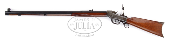 RARE BALLARD NO. 5 PACIFIC SPORTING/TARGET RIFLE. SN 15283. Cal. 38-50. Beautiful sporting rifle with 30″ oct bbl, windgage globe front sight, semi-buckhorn rear sight and a vernier tang sight with 3″ staff. Mounted with nicely figured, uncheckered American walnut, semi-schnable forearm & straight stock with crescent buttplate. It has dbl set triggers & ring loop lever. Bottom of bbl is mounted with two iron guides dovetailed into bottom flat which contains its orig hickory & brass ramrod.” PROVENANCE: Glenn Marsh Collection. CONDITION: Fine. Bbl retains about 90% strong orig blue with scattered spotting and a few small dings. Receiver is mottled silvered case colors with an area turned brown on right side. Stock has a couple of cracks & a chip in wrist and a grain check on let side, otherwise wood is sound and retains most of its orig varnish with light handling & use marks. Buttstock & forearm are orig equipment replacements bearing different serial numbers. Buttstock & buttplate are number “10644” and forearm “27713”. Mechanics are fine, very bright shiny bore with two or three small spots of pitting. 4-59525 JR132 (4,000-7,000)