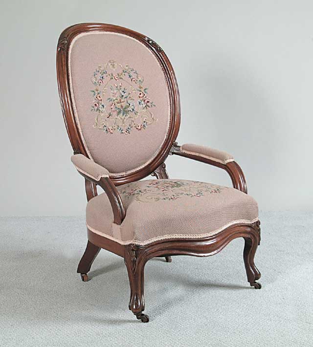 VICTORIAN WALNUT OPEN ARM CHAIR WITH NEEDLEWORK SEAT. Finger carved having floral decorated back and seat on a beige background. Legs terminate with castor feet. SIZE: 40” h x 16” seat height. CONDITION: Very good. 9-93303 (300-500)