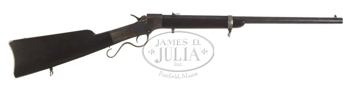 FINE BALL & WILLIAMS BALLARD CIVIL WAR CARBINE. SN 10033. Cal. 44. 22” part oct bbl. Matching numbers marked “BALLARDS PATENT /NOV. 6.1861” on the right side of the frame & “BALL & WILLIAMS /Worcester Mass./ MERWIN & BRAY. AGT’S / NEW YORK.” on the left side of the frame. “NM” cartouche appears in the center of the left side of the stock. His initials appear on top of the stock, on top of the buttplate, on the left side of the receiver and left side of the bbl. Folding rear sight only has three positions 100, 200 and 300 yards. CONDITION: 80% dull blue on the bbl. Bright blue on the extractor guide. Traces of finish elsewhere. Considerable casehardening colors remain on the covered portion of the breechblock. Stock is fine with minor dents and scratches. Mechanically fine. 4-56950 FS257 (3,000-4,000)