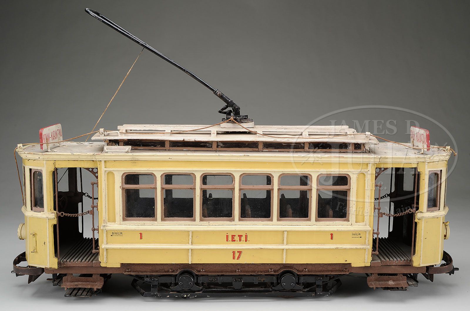 LARGE SCALE MODEL OF A TROLLEY CAR. An absolutely fantastic large scale (4″ track gauge) European style enclosed street trolley car. Undercarriage of heavy gauge steel with an intricate amount of detailing to said undercarriage/framework of this trolley. The body is constructed of wood with a full interior including a multitude of seats, trolley controls, entrance way adornments, glass clerestory and trolley pull. Pull is geared in a fashion that by pulling a string at either end it can be reversed hence when the trolley reaches its final destination it just reverses its course as the conductor walks to the other end. This piece was probably produced by a craftsman with machinist abilities and most likely made in the 1920s or early 30s. Wonderful period paint with some alligatoring to finish. Piece is most unique and a great addition for those who appreciate and understand finely made and detailed railroad memorabilia. SIZE: Approx. 36″ l x 14″ to rooftop. CONDITION: Overall very fine plus! A few minor repairs needed such as reinstalling some loose glass and clerestory and a minor cleaning to eliminate the years of dust and grime. 1-11773 (2,000-3,000) Auction: Advertising, Toy & Doll - Fall 2012 Please Note: All prices include the hammer price plus the buyer’s premium, which is paid by the buyer as part of the purchase price. The prices noted here after the auction are considered unofficial and do not become official until after the 46th day. |