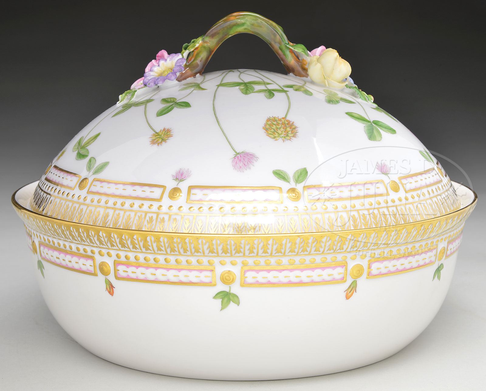 FLORA DANICA ROUND COVERED ENTREE DISH. 20th century, Denmark. The round bowl with conforming domed lid and with handle of interwoven stems terminating in flower heads. The borders with gold gilt decoration of leaf tips. Beneath the lid titled “Trifalium Fragiferum L.” above the Royal Copenhagen mark in underglaze green above four cobalt wavy lines. Lid and bowl both marked with model number “20/3568.” SIZE: 6-1/2″ h x 9-1/2″ overall dia. CONDITION: Very good with no damages or restoration. 9-28868 (1,500-2,000)