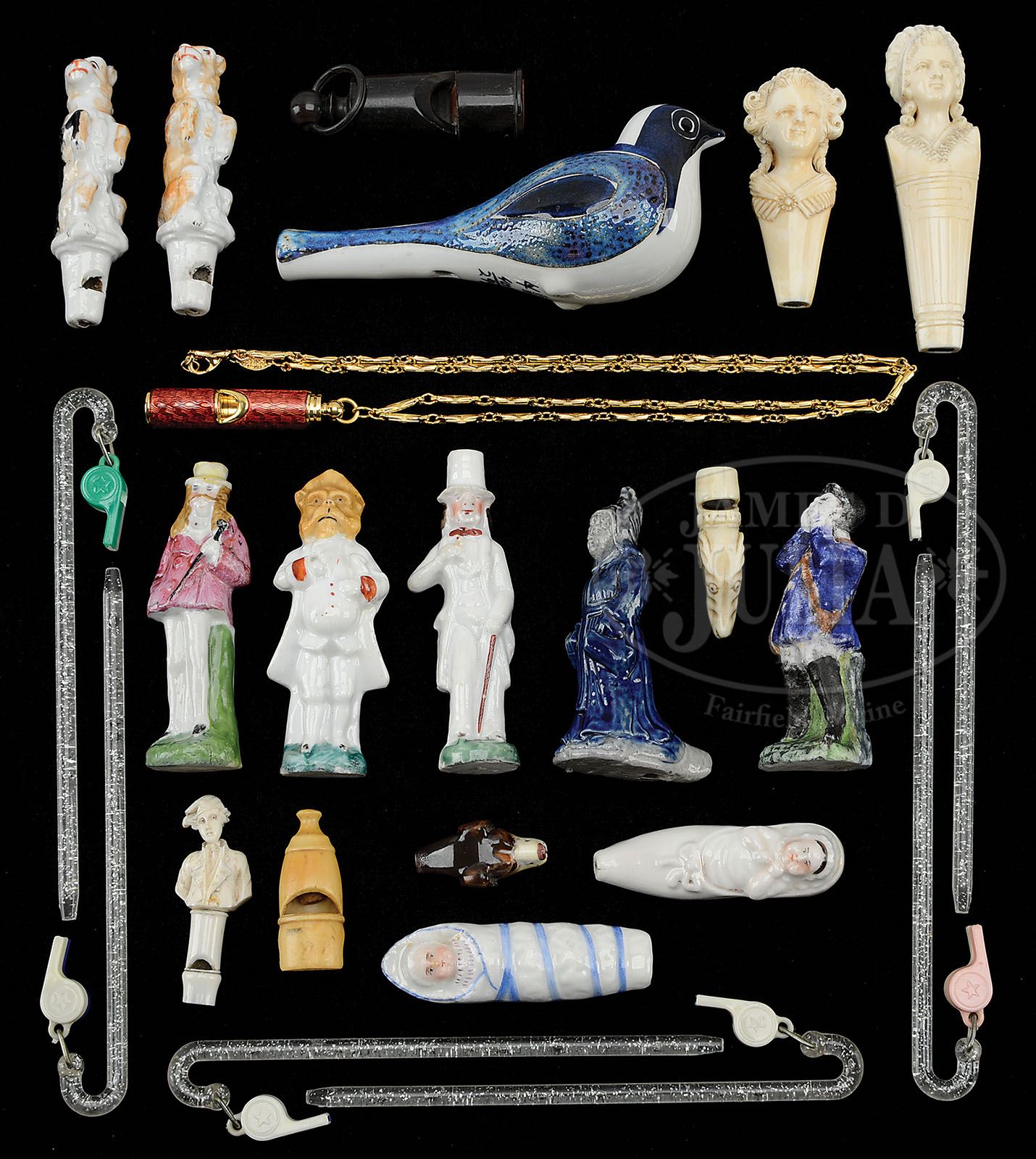 LOT OF 24 VINTAGE WHISTLES. Materials are plastic, porcelain, ivory, bone, and horn, many of which are shown in the book Whistles by Martyn Gilchrist. A very nice grouping of vintage whistles of varied design. Eight whistles are glazed Staffordshire figures, including Frozen Charlottes. Also, three Victorian hand-carved ivory whistles. Other porcelain manufacturers include Worcester, Wade and Royal Copenhagen plus six plastic swizzle sticks with whistles. Also included is a modern rendition of a Faberge pendant whistle (gold-plated) in original Met. Museum of Art box. An interesting and diverse lot. SIZE: Varies. CONDITION: Near excellent. 1-13004-1 (300-500) Auction: Advertising, Toy & Doll - June 2013 Please Note: All prices include the hammer price plus the buyer’s premium, which is paid by the buyer as part of the purchase price. The prices noted here after the auction are considered unofficial and do not become official until after the 46th day. |