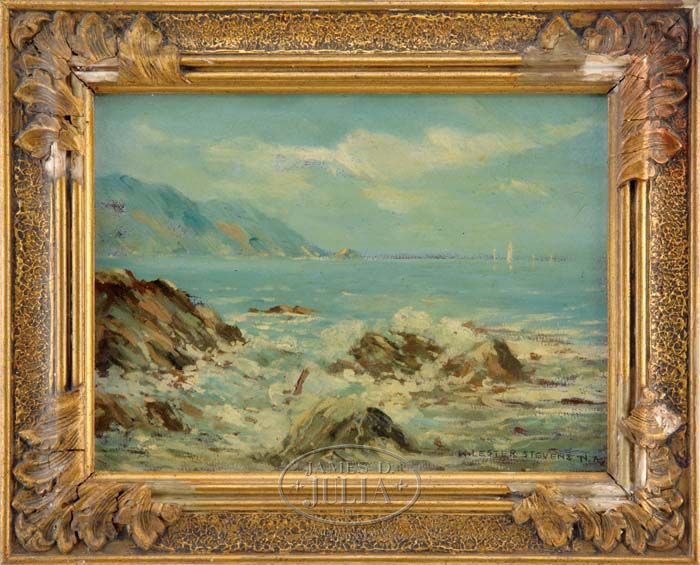 WILLIAM LESTER STEVENS (American 1888-1969) OFF PIGEON COVE. Oil on board coast line scene shows waves crashing on coastal rocky ledge with sailboats on water beyond and hillside shore beyond. Signed lower left “W. Lester Stevens N.A.”. Housed in a gesso gold decorated frame (as is). SIZE: 12” x 16”. CONDITION: Discolored varnish layer and surface dirt. There is a 1” chip in center that has been varnished over. Otherwise good. 9-90285 SM (2,500-3,500)