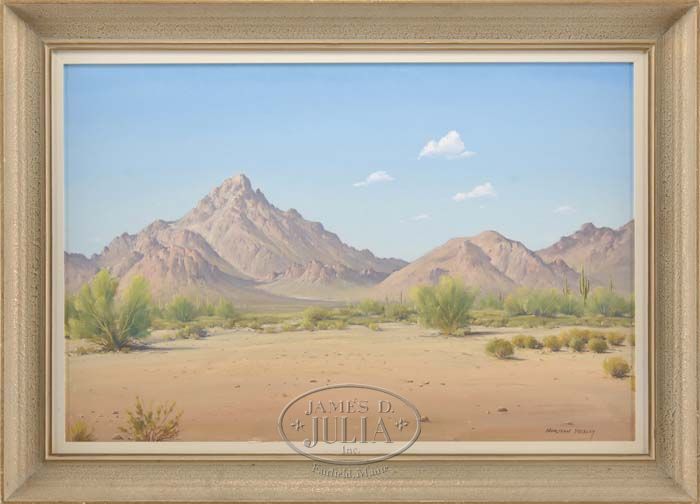 NORMAN HENRY YECKLEY (American, 1914-1994) WESTERN DESERT. Oil on canvas scene shows a sandy desert with cactus and bushes leading to baron tall mountain peaks under a blue and white cloud sky. Signed lower right. Nicely housed in a textured partial wood gilt frame with white liner. SIZE: 24” x 36”. CONDITION: Very good. 9-74886 SM (1,200-1,500)